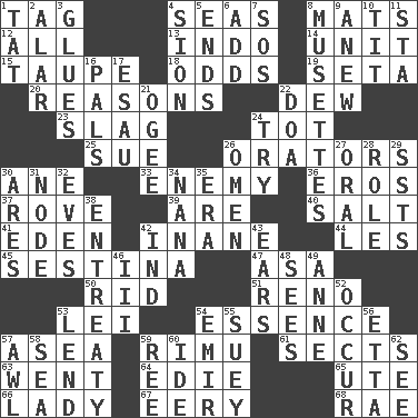 ACROSS 1. Label 4. Oceans 8. Floor protectors 12. 100% 13. _ china 14. A single undivided whole 15. Grayish beige 18. Probability 19. Stalk of a moss capsule 20. Thinks logically 22. Morning condensation 23. Volcanic refuse 24. Small child 25. Take to court 26. Speakers 30. A saturated hydrocarbon 33. Foe 36. Greek god of love 37. Be footloose 39. "We ___ not amused" (Victoria) 40. Table seasoning 41. Paradise 42. Silly 44. French article 45. French poetic form 47. White ___ sheet 50. To free from 51. Western Nevada city 53. Luau accessory 54. Core 57. At sea 59. Tall New Zealand timber tree 61. Religious groups 63. Gone 64. Singer Brickell 65. Shoshoni 66. Kenny Rogers chart-topper in '80 67. Suggestive of the supernatural 68. Actress Charlotte DOWN 1. Make lace 2. Having or resembling wings 3. Cements 4. The Jewish people; Israel 5. Extremities 6. Find the sum of 7. Mayday 8. French bagpipes 9. Afresh 10. Teat (slang) 11. R.R. building 16. Friends 17. He sold his birthright 21. Double curve, resembling the letter S 22. ___ good deed 24. Attempt 26. Sign of something about to happen 27. Spoken 28. Hero or heavy, e.g. 29. Fast planes 30. Ancient Greek god of war 31. Connecting point 32. Nights before holidays 34. Nanny 35. Epoch 38. Plea 42. Indiana (abbr.) 43. Hearing organs 46. One more than two 48. Observes 49. Singer Murray 52. Happen 53. Grant temporary use of 54. Independent ruler or chieftain 55. Chop _ 56. Singer James 57. Leather borer 58. Ocean 59. Portuguese money of account (variant) 60. Binary compound 62. Observe