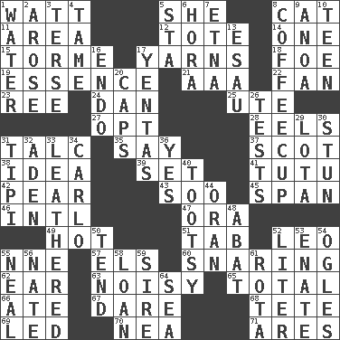 ACROSS 1. Electrical Unit 5. A female animal or person 8. Feline 11. Length times width 12. Lug 14. Single 15. Singer Mel 17. Tall tales 18. Enemy 19. Substance 21. American Automobile Association (abbr.) 22. Avid follower 23. To sift 24. Daniel's nick name 25. Shoshoni 27. Choose 28. Snakelike fish 31. Baby powder 35. Declare 37. Native of Scotland 38. It may be bright or harebrained 39. Put into a specified state 41. Ballerina skirt 42. Lightbulb-shaped fruit 43. "Barney Miller" actor Jack 45. Connect, as a bridge 46. International (abbr.) 47. Mouth or opening 49. Being at a high temperature 51. Keyboard key 52. Lion 55. Compass dir. 57. Raised railways 60. Catching in a trap 62. Ewer handle 63. Annoyingly loud 65. Add up to 66. Had dinner 67. Have the gumption 68. False hair 69. Directed 70. Teachers' org. 71. Ancient Greek god of war DOWN 1. Wetness 2. Came up 3. Laconic 4. Not wild 5. R.R. building 6. Israeli folk dance 7. Inactive volcano in Sicily 8. Java holder (2 wds.) 9. Small Philippine buffalo 10. Adolescent 13. He sold his birthright 16. Inside; within (prefix) 17. Gossips 20. Balmoral and tarboosh 26. Trials 29. Globular water bottle used in Asia 30. Make senseless or dizzy 31. Native american tent (variation) 32. Arabian gulf 33. Resembling or made to resemble leather 34. Monte _, Las Vegas Hotel/Casino 36. Consenting reply 40. A girl or young woman (variant) 44. Northwest Algerian city 48. Blind as ____ 50. Watch over 52. 61 cubic inches 53. Related on the mother's side 54. Stares 55. Anneal 56. Nathan's nickname 58. Grant temporary use of 59. Male parent of an animal 61. Round or rotation of duties 64. Ocean