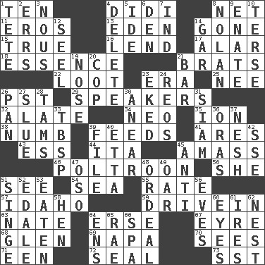 ACROSS 1. Nine, plus one 4. "You Light Up My Life" star Conn 8. Remaining after all deductions 11. Greek god of love 13. Genesis locale 14. Went 15. Loyal 16. Grant temporary use of 17. Having or resembling wings 18. Center 21. Naughty children 22. Spoils 23. Epoch 25. Born 26. Pacific Standard Time (abbr.) 29. Orators 32. Having winglike extensions 34. Modern: prefix 35. Electrically charged atom 38. Unfeeling 39. Eats 41. Ancient Greek god of war 43. Double-curved letter 44. Call ___ day 45. Collect or gather 46. Characterized by complete cowardliness 50. A female animal or person 51. Observe 54. Ocean 55. Pace 57. Potato state 59. Popular '50s hangout 63. Nathan's nickname 64. Celtic language 67. Jane of fiction 68. Small, secluded valley 69. California wine valley 70. Observes 71. Car or cant ending 72. Lick closed 73. Fast jet (abbr.) DOWN 1. Wig 2. Blunders 3. Horse sense 4. Keyboard key 5. Binary compound 6. Lair 7. Indiana (abbr.) 8. Pitcher Ryan 9. Maternal 10. Laconic 12. Sew up the eyelids of hawks and falcons 14. Slender fish 19. Characteristic smell of wine 20. Police officer (slang) 21. Drinking establishment 23. Made supply last 24. Vintage cars 26. Baking dish 27. Turn sharply 28. Scottish caps 30. Approach 31. Thailand, formerly 33. Cook's measure (abbr.) 36. Mouths or openings 37. Soft 39. Do some clerical work 40. Singer James 42. Compass dir. 45. Opposed to 47. Bear (Spanish) 48. Severe or trying experience 49. Boat paddle 51. Burn superficially 52. Peak District village in England 53. Eroded 56. Nights before holidays 58. Layer 60. Snake ____ (dice throw) 61. Angers 62. Egg locale 64. Followers of ems 65. Actress Charlotte 66. Health resort