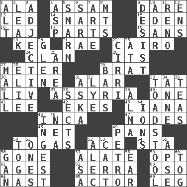 ACROSS 1. Insect wing 4. Indian state 9. Have the gumption 13. Directed 14. Don Adams' spy role 15. Locale of original sin 16. _ Mahal 17. Actors' quests 18. Without 19. Barrel 21. Actress Charlotte 22. Capital of Egypt 24. Dollar (slang) 26. ___ a Wonderful Life 27. Distance measurement 29. Naughty child 30. Place in a line 31. Having or resembling wings 33. Make lace 36. 54 in ancient Rome 37. Nineveh was its capital 40. Single 41. Area sheltered from the wind 42. Makes supply last 43. Climbing, woody, usually tropical vines 45. South American Indian 47. Methods 48. Remaining after all deductions 49. Zero-star reviews 50. Ancient Roman robes 52. Adept person 54. R.R. building 56. Went 57. Having winglike extensions 59. Elect 61. Matures 62. Father Junipero _ 63. Bear (Spanish) 64. Political cartoonist Thomas 65. Thespian 66. Part of a journey DOWN 1. The first octave above the treble staff 2. Path through which fluid escapes 3. Descriptive word 4. Cleo's killer 5. Excessive but superficial compliments 6. "Two Mules for Sister ____" 7. Johnson of "Laugh-In" 8. Mountains (abbr.) 9. Stop 10. The sixth month of the Jewish calendar 11. Former U.S. Attorney General Janet 12. Followers of ems 20. Small, secluded valley 22. High-altitude cloud 23. _ moment's notice (2 wds.) 25. Length times width 27. Promenade 28. Writer Wiesel 29. Oblong pieces of solid material 31. "____ silly question..." 32. Sodium hydroxide 33. Inedible or poisonous agaric 34. Singer Murray 35. Afternoon social gatherings 38. Religious groups 39. _ mater 44. Charged particles 45. Eat 46. Teachers' org. 49. Stone: prefix 50. Ancient Roman robe 51. Washington bills 52. Actor Baldwin 53. Draw slowly or heavily 55. Domed church section 56. Separate the seeds from cotton 57. White ___ sheet 58. Hearing organ 60. Coat; cloak