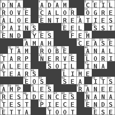 ACROSS 1. Heredity factor (abbr.) 4. First man 8. To provide with a ceiling 12. Be footloose 14. Bodily heat indicating an inflammation 16. Legendary monster 17. Medicinal plant 18. Pleas 20. Aches 22. Snakelike fish 23. Fast jet (abbr.) 24. Conclude 25. Consenting reply 28. Opposite of masc. 30. Nanny 31. Stop 35. Scottish cap 37. Loose flowing garment 40. Of or related to the anus 41. Canvas cover 42. Impudent aggressiveness 44. Australian parrot (variant) 45. Toward shelter 46. Earth 47. _ tizzy (2 wds.) 48. Rends 50. Citrus frut 52. Greek goddess of the dawn 54. Ocean 55. It is 58. Electrical Unit 61. French article 63. The wife of a rajah (variant) 65. Dwellings 70. Nanny 71. Trial 72. Part 73. Extremities 74. Singer James 75. A blast of a horn 76. Compass dir. DOWN 1. Window treatment 2. Pitcher Ryan 3. Keep away from 4. Adept person 5. Daniel's nick name 6. The first octave above the treble staff 7. Greater amount 8. Small bed 9. Armor plate that protects the chest 10. Angers 11. For fear that 13. Car or cant ending 15. Coral collection 19. Actor Baldwin 21. Symbol (abbr.) 26. Merit 27. Imelda's hoard 29. Ear of corn 30. Electrical Unit 32. Soon (poet.) 33. "Two Mules for Sister ____" 34. Biblical high priest 35. Lie 36. Type of rug 38. Sis' sibling 39. Vices 41. Make lace 43. Writer Wiesel 49. Exchanged or delivered for money 51. Make imperfect 53. Ooze 55. Silly 56. Watches over 57. Gospel singer Marvin 58. Johnson of "Laugh-In" 59. Confront 60. Inconspicuous attention getter 62. In a ____ (agitated or irritated) 64. One (Scot) 66. Call ___ day 67. Corporate head (abbr.) 68. Environmental prefix 69. Arrange properly for use