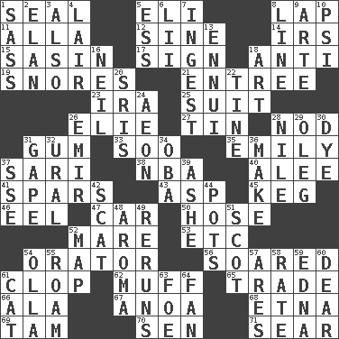 ACROSS 1. Lick closed 5. Connecticut Ivy Leaguer 8. Pet locale 11. Silent film actress Nazimova 12. Trig term 14. Big collection agency 15. Indian antelope 17. Public display of a written message 18. Opposed to 19. Sounds asleep 21. Main course 23. Lyricist Gershwin 25. Set or collection 26. Writer Wiesel 27. Metal container 28. Dreamland 31. Chewing product 33. "Barney Miller" actor Jack 35. Poet Dickinson 37. Indian skirt 38. Basketball assoc. 40. Toward shelter 41. Practice fights 43. Viper 45. Barrel 46. Snakelike fish 47. 4-wheeled motor vehicle 50. Flexible conduit 52. Female horse 53. And so on (abbr.) 54. Speaker 56. Flew 61. Hoof sound 62. Bungle 65. Swap 66. Wing 67. Small Philippine buffalo 68. Inactive volcano in Sicily 69. Scottish cap 70. Elected rep. 71. Burn superficially DOWN 1. Backtalk 2. Enthusiasm 3. In addition 4. Den 5. Curvy letter 6. Cards in a Roman deck? 7. Swallow 8. Actor's bit 9. Johnson of "Laugh-In" 10. 23rd letter of the Greek alphabet 13. World-weariness 16. Famous astronaut Armstrong 18. Nonscientific branch of learning 20. Indian titles of respect 22. Prong on a fork 24. A really long time 26. Independent ruler or chieftain 28. Mediterranean tributary 29. Cassini of fashion 30. Color 31. Yawn 32. Mountain range 34. Chief or king in Benin or Nigeria 36. Create 37. Compass dir. 39. American tennis player Robert 42. Scram! 44. Cooking vessels 48. Odor 49. Summer TV shows 51. Highlander 52. Atlas unit 54. Rounded earthenware pot or jar 55. Wander 57. Ancient Greek god of war 58. Assign a rank or rating to 59. Pulitzer Prize-winning author Ferber 60. Letter starter 61. Feline 63. Enemy 64. Air blower