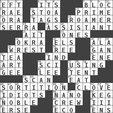 ACROSS 1. Newt 4. It is 7. Alliance 11. Actress Charlotte 12. Portico 13. A-one 14. Mouth or opening 15. Labels 16. Wanderer 17. Father Junipero _ 19. Helper 21. Small island 23. Washington bills 24. Gumbo ingredient 25. Raised railways 26. Insect wing 29. Take or capture by force 30. To separate or throw off 31. Separate the seeds from cotton 32. Beverage made from leaves 33. Working for oneself (abbr.) 34. Compass dir. 35. Tate display 36. _-fi 37. Putting into practice 40. Unit of force equal to gravity 41. Area sheltered from the wind 42. Portable shelter 43. Glance over 45. Consume 46. Making a chance decision by using lots 51. Garlic unit 55. Foolish or stupid persons 56. Billionth: prefix 58. Barrel 59. Having high moral qualities 60. Group working together 61. One more than two 62. Celtic language 63. Environmental prefix 64. Followers of ems DOWN 1. Greek god of love 2. Conductor's collection 3. Rend 4. Call ___ day 5. Ancient Roman robe 6. Backtalk 7. Naughty children 8. Pale green bean 9. Sign of something about to happen 10. Certainty 12. Flight of steps 13. Airs 16. Remove soap 18. Libertine 20. Having a sole or soles 22. Make lace 24. Speak pompously 25. Bert's buddy 26. Rep 27. Long (Scottish) 28. One (Scot) 29. Past tense of be (plural) 32. Label 33. Ancient Celtic tribe of eastern Britain 36. Narrow boards 37. Shoshoni 38. Manatee 39. International (abbr.) 43. Took without asking 44. Quote 46. Trig term 47. Scent 48. Teases 49. At one time in the past 50. Drug cop 52. Migrant worker of the '30s 53. Distinctive style or manner 54. The front part of a cuirass 57. Modern: prefix