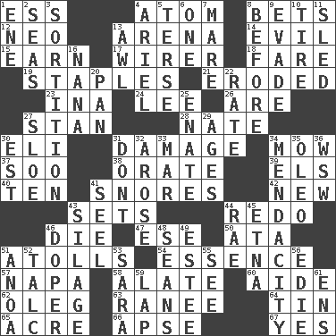 ACROSS 1. Curvy letter 4. Smallest unit of an element 8. Antes 12. Modern: prefix 13. Sports stadium 14. Tending to cause great harm 15. Merit 17. One who wires 18. Conductor's collection 19. Paper fasteners 21. Eaten away 23. _ tizzy (2 wds.) 24. Area sheltered from the wind 26. "We ___ not amused" (Victoria) 27. Comedian Laurel of Laurel & Hardy 28. Nathan's nickname 30. Connecticut Ivy Leaguer 31. Break 34. Cut the grass 37. "Barney Miller" actor Jack 38. Speak pompously 39. Raised railways 40. "___ Little Indians" 41. Sounds asleep 42. ___ Haven, CT 43. Puts into a specified state 44. Redecorate 46. Expire 47. Compass dir. 50. "One Day ___ Time" 51. Ringlike coral islands and reefs 54. Substance 57. California wine valley 58. Having winglike extensions 60. Helper 62. Cassini of fashion 63. The wife of a rajah (variant) 64. Shallow baking pan 65. 1/640 square mile 66. Domed church section 67. Consenting reply DOWN 1. Compass dir. 2. Oceans 3. Making a chance decision by using lots 4. Satellite of Uranus 5. Laconic 6. Single 7. Female horse 8. Prior to 9. Elude 10. Hoop that covers a wheel 11. Downhill vehicle 13. Leather borer 16. Grandmother 20. Baking dish 22. Pace 25. Maternal 27. _ gin 29. Eras 30. Eastern Standard Time (abbr.) 31. Do not 32. Came up 33. Make imperfect 34. Ananias' fault 35. Margarine 36. Compass dir. 41. Sew up the eyelids of hawks and falcons 43. Fodder prepared in a silo 44. Actress Charlotte 45. Inactive volcano in Sicily 46. Drug addict 48. Actors Connery and Penn 49. First name in cosmetics 51. Small Philippine buffalo 52. Baby powder 53. "Two Mules for Sister ____" 55. Observe 56. Singer Brickell 59. Pet locale 61. Followers of ems