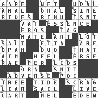 ACROSS 1. Stare wonderingly 5. Fish or hair follower 8. Allodial 12. Of or related to the anus 13. Spoken 15. Trig term 16. Amusement-park features 18. Tall New Zealand timber tree 19. Is not 20. Large container 22. Center 24. Greek god of love 26. Label 27. Nathan's nickname 28. Tate display 29. Car dealer's back yard 32. Table seasoning 35. Singer James 37. "We ___ not amused" (Victoria) 38. Brightly colored fish 39. Superhero pair 40. Not this but _ 41. Direct toward a target or goal 42. Person who is morally reprehensible 43. Celtic language 44. Actress Charlotte 45. For each 46. Flaplike coverings 49. Mouth or opening 50. Stricken, poetically 51. Contrary to your interests or welfare 55. Luau course 56. Woody plant 57. Periodic rise and fall of the sea level 59. Lean end of the neck 63. One who doesn't tell the truth 64. Travel by water 65. Moving, as bait 66. Draw slowly or heavily 67. Cartoonist voice _ Blanc 68. Locale of original sin DOWN 1. Slender fish 2. Black tropical American cuckoo 3. Writing tablet 4. Veterans Day date 5. Not either 6. One of the Great Lakes 7. Scottish caps 8. Exploiting 9. Flat circle 10. Queen of England 1702-14 11. Allow 14. A period of five years 17. "Two Mules for Sister ____" 21. Small child 23. Erode 25. Sowing specialist 28. Ringlike coral islands and reefs 29. Cowardly lion portrayer 30. Mouths or openings 31. False hair 32. Fly high 33. Capital of Western Samoa 34. Unable to walk 36. Third day of the wk. 40. A testis 42. Centers of feelings and intuitions 45. Before (prefix) 47. Mischievous child 48. "Vaya con ____" 49. Unconcealed 51. Roberta Peters solo 52. Letter starter 53. Thailand, formerly 54. Singer Brickell 56. Affectionate concern, for short 58. Pipe bend 60. To free from 61. "___ Maria" 62. Commissioned mil. rank
