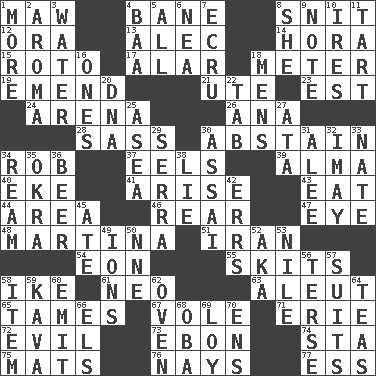 ACROSS 1. Opening into something insatiable 4. Object of repulsion 8. In a ____ (agitated or irritated) 12. Mouth or opening 13. Actor Baldwin 14. Israeli folk dance 15. Printing process, for short 17. Having or resembling wings 18. Distance measurement 19. Make improvements or corrections to 21. Shoshoni 23. Eastern Standard Time (abbr.) 24. Sports stadium 26. Santa ___, CA 28. Backtalk 30. Refrain by choice 34. Director Reiner 37. Snakelike fish 39. _ mater 40. Supplement with great effort 41. Originate 43. Consume 44. Type of rug 46. Stern 47. Sight organ 48. Chrissie's court nemesis 51. SW Asia republic 54. Period of immesurable duration 55. Burlesque acts 58. Eisenhower's nickname 61. Modern: prefix 63. Native American of Southwest Alaska 65. Domesticates 67. Short-tailed, large-bodied rat 71. One of the Great Lakes 72. Tending to cause great harm 73. Inky black, to poets 74. R.R. building 75. Floor protectors 76. Negative votes 77. Double-curved letter DOWN 1. Greater amount 2. Odor 3. Wetness 4. Sound made by sheep 5. 100% 6. Teachers' org. 7. Shade of tan 8. A female animal or person 9. Musical sound 10. Angers 11. Small pie 16. Singles 18. Not women's 20. Heredity factor (abbr.) 22. Keyboard key 25. Toward the sea 27. _ moment's notice (2 wds.) 29. Spanish missionary in California 30. Slender Brazilian palm 31. Toward shelter 32. "If ____ say so..." 33. Nathan's nickname 34. 480, 500 or 516 sheets of paper 35. Gumbo ingredient 36. Fermented drink made from hops 38. Falsehood 42. Blunders 45. Had dinner 49. Charged particles 50. Compass dir. 52. Alias (abbr.) 53. Mediterranean tributary 56. Laconic 57. Costumes for special activities 58. Detail 59. Polynesian shrub of the pepper family 60. Send forth 62. Baking chamber 64. Afternoon social gatherings 66. Raised railways 68. Chief or king in Benin or Nigeria 69. Myrna of the movies 70. Followers of ems