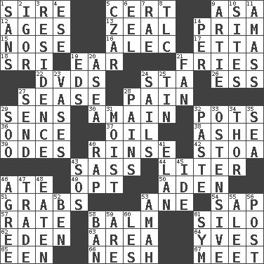 ACROSS 1. Title for a man of rank and authority 5. Sure thing 9. White ___ sheet 12. Eras 13. Ardor 14. Demure 15. Characteristic smell of wine 16. Actor Baldwin 17. Singer James 18. _ Lanka 19. Ewer handle 21. Strips of potato fried in deep fat 22. Movie discs 24. R.R. building 26. Double-curved letter 27. Gospel singer Marvin 28. Ache 29. Elected reps. 30. With great haste 32. Plant holders 36. Single time 37. Lubricate 38. American tennis player Robert 39. Lyric poems 40. Wash lightly 42. Portico 43. Backtalk 44. 61 cubic inches 46. Had dinner 49. Choose 50. An important port of Yemen 51. Seizes 53. A saturated hydrocarbon 54. Plant excrement 57. Pace 58. Lip ointment 61. Grain storage tower 62. Genesis locale 63. Type of rug 64. Jacques Cousteau's middle name 65. Car or cant ending 66. Delicate 67. Rendezvous DOWN 1. Without 2. Composer Stravinsky 3. Dwelling 4. Compass dir. 5. Russian ruler of old 6. Snakelike fish 7. Actress Charlotte 8. Affectionate concern, for short 9. Nick name for Arthur 10. Locates 11. Collect or gather 14. For each 19. Begley and Asner 20. Toward the sea 21. Air blower 23. Flower holders 24. Moves on water 25. Metal container 27. Post 28. Aches 29. "Barney Miller" actor Jack 31. Damp 32. Thick mixture 33. Clearly or manifestly demonstrative 34. Son of Odin 35. Ocean 40. Strike 41. Liveliness 43. Mayday 45. Binary compound 46. Match 47. Buy and sell 48. Consumed 52. Benjamin's nick name 53. Nursemaid 55. Toward shelter 56. Mail 58. Forbid 59. "We ___ not amused" (Victoria) 60. French article 61. Symbol (abbr.)