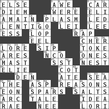 ACROSS 1. Otherwise 5. Deep reverence 8. 4-wheeled motor vehicle 11. South Vietnam president (1954) 12. We are 14. Biblical high priest 15. At full speed 17. Suffix with ecto or cyto 18. Directed 19. Small, flat, pigmented spot on the skin 21. Luau accessory 22. Area sheltered from the wind 23. Curvy letter 24. Chop off 25. Strike 27. Snakelike fish 28. "Mermaids" star 31. Old wives' tales, e.g. 35. Small drink 37. Casino tip 38. Ancient Greek god of war 39. Non-commissioned officer (abbr.) 41. Singles 42. Vertical spar for supporting sails 43. Fast jet (abbr.) 45. Egg locale 46. Writer Wiesel 47. Small bed 49. Lair 51. Had dinner 52. Ocean 55. Definite Article 57. Viper 60. Thinks logically 62. A really long time 63. Practice fights 65. Table seasonings 66. Curve 67. Story 68. It may be bright or harebrained 69. Actress Charlotte 70. Born 71. Australian parrot (variant) DOWN 1. Peak District village in England 2. Citrus fruits 3. Actors Connery and Penn 4. Give off 5. Leather borer 6. Welt 7. Celtic language 8. Portable communications device 9. Toward shelter 10. Travel on or in a vehicle 13. Independent ruler or chieftain 16. "Death on the ____" 17. Cotton for raincoats, e.g. 20. Travels 26. 13-14th century defensive garment 29. Makes supply last 30. State of inaction 31. Unable to walk 32. Taken by mouth 33. Home 34. First name in cosmetics 36. Personal Computers (abbr.) 40. Motion picture awards 44. Carryall 48. Beverages made from leaves 50. Political cartoonist Thomas 52. Twentieth part of a lira 53. Keyboard key 54. Slender Brazilian palm 55. Rend 56. Israeli folk dance 58. Connect, as a bridge 59. Diluted with white 61. Travel by water 64. Portuguese money of account (variant)