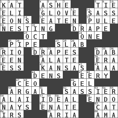 ACROSS 1. Krazy ___ of comics 4. American tennis player Robert 8. Standoff 11. Connecticut Ivy Leaguer 12. Michael Jackson trademark 14. Backtalk 15. Immeasurably long periods of time 17. Consumed 18. Whine 19. Nestling 21. Window treatment 23. Sep. follower 24. Single 25. Corncob 27. Thick slice 30. _ de Janeiro 31. Window treatments 34. Small moist lump or mass 37. Car or cant ending 38. Having winglike extensions 39. Period 40. Curvy letter 41. Sunflower state 43. American Automobile Association (abbr.) 44. Hiding places for outlaws 45. Suggestive of the supernatural 47. Corporate head (abbr.) 49. Set 50. Therefore, facetiously 52. More impudent 56. Jai _ 57. Perfect 60. Inside; within (prefix) 61. Negative votes 62. Maternal 63. Domesticated feline 64. Big collection agency 65. Operatic vocal solo 66. Nursemaid (var.) DOWN 1. Peachy ____! 2. Medicinal plant 3. Metal containers 4. Representative 5. Volcanic refuse 6. Being at a high temperature 7. First lady 8. Grayish beige 9. Capri or Wight 10. Compass dir. 13. Conclusion 14. Connect, as a bridge 16. Constrict 20. On the rocks 22. Director Reiner 25. Sliced desserts 26. Charged particles 27. Connects, as a bridge 28. Allows 29. At sea 30. To separate or throw off 32. Immoral or dissolute person 33. Actor Alda or Thicke 34. Letter starter 35. Like ___ of sunshine 36. Sound made by sheep 42. Perceives with the eye 44. ___ good deed 46. Otherwise 47. Trading vessels 48. Armor plate that protects the chest 49. An organ shaped like a helmet 50. Having or resembling wings 51. Falsehood 52. Suttee (variant) 53. South American Indian 54. Dutch treat 55. Round or rotation of duties 56. Cuckoo 58. Heredity factor (abbr.) 59. Ewer handle