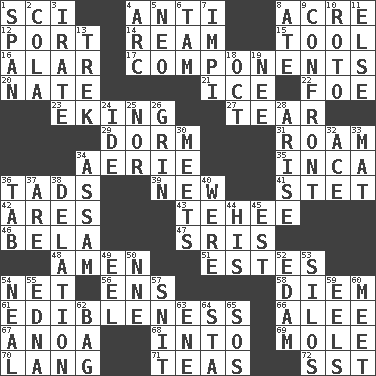 ACROSS 1. _-fi 4. Against 8. 43,560 square feet 12. Left side of a ship or aircraft 14. 480, 500 or 516 sheets of paper 15. Instrument 16. Having or resembling wings 17. Pieces 20. Nathan's nickname 21. Frozen water 22. Enemy 23. Supplementing with great effort 27. Separate forcefully 29. Dormintory (informal) 31. Wander 34. Nest on high 35. South American Indian 36. Bits 39. ___ Haven, CT 41. Proofreading order 42. Ancient Greek god of war 43. Giggle 46. Actor Lugosi 47. Indian titles of respect 48. So be it 51. _____ Park, CO 54. Remaining after all deductions 56. Followers of ems 58. South Vietnam president (1954) 61. The property of being fit to eat 66. Toward shelter 67. Small Philippine buffalo 68. To the inside or interior of 69. Undercover agent 70. Long (Scottish) 71. Afternoon social gatherings 72. Fast jet (abbr.) DOWN 1. Connect, as a bridge 2. Root beer relative 3. Feeling or showing extreme anger 4. Curve 5. Modern: prefix 6. Scottish cap 7. Body of Kaffir warriors 8. Had dinner 9. Meet 10. Printing process, for short 11. Otherwise 13. Long journey 18. Sep. follower 19. Born 24. Binary compound 25. And not 26. Broad smile 28. Ascend 30. Confronts 32. Adept person 33. Floor protector 34. Indian state 36. Keyboard key 37. "We ___ not amused" (Victoria) 38. Conveyance 40. Past tense of be (plural) 44. Part of HMS, perhaps 45. Eastern Standard Time (abbr.) 49. Snakelike fish 50. Compass dir. 52. Dutch treat 53. Grain storage towers 54. Actress Patricia 55. Pulitzer Prize-winning author Ferber 57. In a ____ (agitated or irritated) 59. Snakelike fish 60. Confront 62. Paper or plastic container 63. Compass dir. 64. R.R. building 65. Distress signal