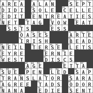 ACROSS 1. Type of rug 5. ____ Jay Lerner 9. Back-to-school mo. 13. "You Light Up My Life" star Conn 14. Not divided or shared with others 15. Cell (Danish) 16. Prepare for publication 17. Pleas 19. Remaining after all deductions 20. Label 21. Solemn pledge 22. Ingest 23. Fast planes 25. Curvy letter 26. Fertile tracts in a desert 30. Johnson of "Laugh-In" 34. From or relating to Ireland 35. Necklace unit 36. Famous astronaut Armstrong 39. Laconic 42. Allows 43. Jane of fiction 44. Bert's buddy 46. Compass direction 47. Flat circles 48. Grow older 51. Singer James 54. Take to court 57. Writing instrument 58. Directed 60. Plant excrement 62. Interpreter 65. "Two Mules for Sister ____" 66. Match 67. Small boys 68. Scent 69. Nanny 70. Singer Brickell 71. Posted DOWN 1. An important port of Yemen 2. Amusement-park features 3. Prepares for publication 4. Small island 5. At sea 6. Protracted 7. The first octave above the treble staff 8. Boldness 9. Put into a specified state 10. Writer Wiesel 11. Entreaty 12. Trial 15. Crow sounds 18. Greek goddess of the dawn 20. Russian ruler of old 24. Rest room 27. Be seated 28. Compass dir. 29. Tear up 30. Most capable 31. To separate or throw off 32. Make lace 33. Begley and Asner 36. ___ Haven, CT 37. Sight organ 38. Big collection agency 40. Indian title of respect (Mr.) 41. Followers of ems 45. On the rocks 48. Domed church section 49. Set 50. Maternal 52. Sadhe (variant) 53. Composer Copland 54. Comedian Laurel of Laurel & Hardy 55. Capital and largest city of Mongolia 56. Merit 58. Farming town in central California 59. Celtic language 61. Component 63. Teachers' org. 64. Small amount or degree 65. Distress signal