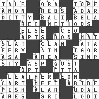 ACROSS 1. Lie 5. Mouth or opening 8. Drink excessively 12. At once, immediately (arch.) 13. Confederate soldiers (slang) 15. The sixth month of the Jewish calendar 16. Short, simple song 18. Indonesian resort city 19. Actor Lugosi 20. To sift 22. Modes 24. Otherwise 26. Corporate head (abbr.) 27. Tenement units (abbr.) 28. Spanish title 29. Floor protector 32. Narrow board 35. Burrowing marine mollusk 37. "One Day ___ Time" 38. Suggestive of the supernatural 39. Direct toward a target or goal 40. Russian composer Stravinsky 41. White ___ sheet 42. Type of rug 43. Simple or foolish person 44. Filthy place 45. Viper 46. Abrupt rush of wind 49. Elect 50. Singer James 51. Cordwainer's material 55. Period of immesurable duration 56. Heavy open wagon 57. Confront 59. Tolerate 63. Expression of disdain 64. Having or resembling wings 65. Freehold land 66. Ancient Greek god of war 67. _ Lanka 68. Farming town in central California DOWN 1. Small amount or degree 2. Black tropical American cuckoo 3. Car dealer's back yard 4. Plea 5. Globe 6. 480, 500 or 516 sheets of paper 7. Competent 8. Off limits 9. Wrote a lyric poem 10. Friends 11. Period 14. "Cheers" or "Ellen" 17. Sharp bark 21. Eastern Standard Time (abbr.) 23. Layer 25. Fortification 28. Break 29. Wise men 30. Smallest unit of an element 31. Canvas cover 32. Oceans 33. For fear that 34. Like ___ of sunshine 36. Falsehood 40. Byzantium, centuries later 42. Respiratory problem 45. Fitting 47. Shoshoni 48. Portico 49. Expletives 51. Den 52. Celtic language 53. Snakelike fish 54. Located in or toward the back 56. Accounting whiz (abbr.) 58. Three (prefix) 60. Wedding promise 61. June honoree 62. Connecticut Ivy Leaguer
