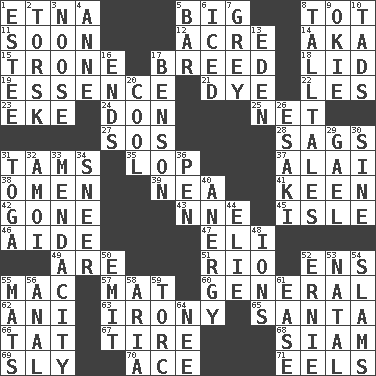 ACROSS 1. Inactive volcano in Sicily 5. Massive 8. Small child 11. Within a short period 12. Measure of real estate 14. Alias (abbr.) 15. Heavy duty weighing machine 17. A special lineage 18. Flaplike covering 19. Core 21. Color 22. French article 23. Make supply last 24. Spanish title 25. Fish or hair follower 27. Mayday 28. Settles 31. Scottish caps 35. Trim (branches) 37. Jai _ 38. Sign of things to come 39. Teachers' org. 41. Peachy ____! 42. Went 43. Compass dir. 45. Capri or Wight 46. Assistant 47. Connecticut Ivy Leaguer 49. "We ___ not amused" (Victoria) 51. _ de Janeiro 52. Followers of ems 55. Big _ 57. Floor protector 60. Commissioned military rank 62. Cuckoo 63. Literary sarcasm 65. Before Barbara or Clara 66. Make lace 67. Become fatigued 68. Thailand, formerly 69. Wily 70. Adept person 71. Snakelike fish DOWN 1. First name in cosmetics 2. Cod relative 3. Trap for birds or small mammals 4. Singer Murray 5. Tavern 6. On the rocks 7. Jennifer or Joel 8. Baron Munchausen's specialties 9. Migrant worker of the '30s 10. Small amounts or degrees 13. Locale of original sin 16. Conclusions 17. Gillaume's butler role 20. Calm and collected 26. 1973 Nobel Price Winner (Physics) Leo 29. Highlander 30. Trig term 31. Ancient Roman robe 32. Mine, in Marseilles 33. Ananias' fault 34. Contemptuous expression 36. Writing instrument 40. Disorder of the immune system 44. Writer Wiesel 48. Charged particles 50. Send forth 52. Bert's buddy 53. Brizilian seaport 54. Hits or strikes with great force 55. Floor coverings 56. Of or related to the anus 58. Operatic vocal solo 59. Torque (variant) 61. Comfort 64. Born