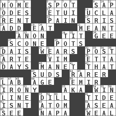 ACROSS 1. Residence 5. Specific locale 9. Plant excrement 12. Lyric poems 13. Needle case 14. Southern CA. univ. 15. Monthly bill 16. Ache 17. Indian titles of respect 18. Increase 19. Ingest 21. Intended 22. At once, immediately (arch.) 24. Teat (slang) 26. Unit of force equal to gravity 27. Biscuitlike quick bread 28. Cooking vessels 29. Raised platform 30. Puts on (as clothing) 32. Mail 36. Johnson of "Laugh-In" 37. Zeal 38. Singer James 39. 24-hour periods 40. French painter Edouard 42. Not this but _ 43. Soap bubbles 44. More uncommon 46. Experiment locale 49. Personal question 50. Independent ruler or chieftain 51. Literary sarcasm 53. Alias (abbr.) 54. Victory 57. Actor's bit 58. Deli pickle 61. Event that recurs at intervals 62. Is not 63. Tiny particle 64. At sea 65. Perceive with the eye 66. California wine valley 67. Welt DOWN 1. Israeli folk dance 2. Wrote a lyric poem 3. Ananias' fault 4. Eastern Standard Time (abbr.) 5. Back-to-school mo. 6. Parent Teacher Assoc. 7. Fr. "Yes" 8. Metal container 9. Strangle with an iron collar 10. Place in a line 11. Thick mixture 14. Purpose 19. A really long time 20. Afresh 21. Mountains (abbr.) 23. Olfactory organs 24. Singer Mel 25. ___ a Wonderful Life 27. "Two Mules for Sister ____" 28. Aches 29. June honoree 31. Dodge 32. _ dish (used to culture cells) 33. Else 34. Play the lead 35. Make lace 40. Java container 41. Long journey 43. Declare 45. Wet nurse (var.) 46. Ms. Damita and namesakes 47. Get up 48. Child's nurse 52. Remaining after all deductions 53. _ mater 55. The content of cognition 56. Anneal 58. Daniel's nick name 59. Call ___ day 60. Trim (branches) 61. The 23rd letter of the Hebrew alphabet