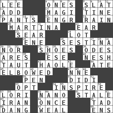 ACROSS 1. Area sheltered from the wind 4. Singles 8. Narrow board 12. Find the sum of 13. Wise men 14. Prong on a fork 15. Leg coverings 18. Engineer (abbr.) 19. Water falling in drops from the sky 20. Chrissie's court nemesis 22. Ewer handle 23. Shrivel 24. Car dealer's back yard 25. Compass dir. 26. French poetic form 30. Not either 33. Imelda's hoard 36. Lyric poems 37. Ancient Greek god of war 39. Compass dir. 40. Tender 41. Tense 42. White Person, in Hawaii 44. Had dinner 45. Shoved, as through a crowd 47. Compass dir. 50. Fenced enclosure 51. "You Light Up My Life" star Conn 53. Elect 54. Stimulate to action 57. Australian parrot (variant) 59. Billionth: prefix 61. Lacking originality or spontaneity 63. SW Asia republic 64. Single time 65. Small amount or degree 66. Mild oath, euphamism for damn 67. Welt 68. Followers of ems DOWN 1. Infant locale 2. Dutch treat 3. Ferber et al. 4. Presage 5. Grandmother 6. Ovum 7. Title for a knight 8. Ski resort town in Vermont 9. One who doesn't tell the truth 10. Cuckoo 11. Nine, plus one 16. Woody plant 17. Comedian Laurel of Laurel & Hardy 21. Angers 22. Greek goddess of the dawn 24. French article 26. Stitch closed the eyes of (a falcon) 27. The content of cognition 28. A home for chicks 29. American tennis player Robert 30. Nathan's nickname 31. Spoken 32. Reuben's nickname 34. Froth on beer 35. Bear (Spanish) 38. Discontinuing 42. Layer 43. Conclusions 46. Soggy 48. Cuts off 49. Prepare for publication 52. Feeling or showing extreme anger 53. Northwest Algerian city 54. South American Indian 55. Christmas carol 56. Enthusiasm 57. Hat (slang) 58. Mouth or opening 59. Immediately 60. One (Scot) 62. Begley and Asner