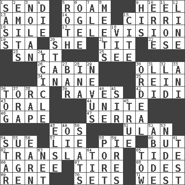 ACROSS 1. Transmit 5. Wander 9. The bottom of a shoe or boot 13. Mine, in Marseilles 14. Stare 15. High-altitude cloud 16. Filth; sediment 17. Household entertainment appliance 19. R.R. building 20. A female animal or person 21. Teat (slang) 22. Compass dir. 23. In a ____ (agitated or irritated) 25. Observe 26. Apartment or room in a ship 30. Rounded earthenware pot or jar 34. Empty; void 35. It's straight from the horse's mouth 36. Torque (variant) 39. All-night dance parties 42. "You Light Up My Life" star Conn 43. Taken by mouth 44. Join together 46. Stare wonderingly 47. Father Junipero _ 48. Greek goddess of the dawn 51. Uhlan (variant) 54. Take to court 57. Untruth 58. Sliced dessert 60. On the contrary 62. Interpreter 65. Periodic rise and fall of the sea level 66. Match 67. Hoop that covers a wheel 68. Lyric poems 69. Monthly bill 70. Puts into a specified state 71. 270 degrees DOWN 1. Backtalk 2. Sends forth 3. Pitcher Ryan 4. Pass on 5. Writer of Portnoy's Complaint (1969) 6. Double curve, resembling the letter S 7. Everything 8. Confronts 9. Part of HMS, perhaps 10. One of the Great Lakes 11. Greek god of love 12. Actor's bit 15. Quote 18. Compete 20. Comedian Laurel of Laurel & Hardy 24. Ice on the eave 27. Oblong piece of solid material 28. _ tizzy (2 wds.) 29. Congenital growth or mark on the skin 30. Severe or trying experience 31. Luau accessory 32. Flaplike covering 33. Cuckoo 36. Coat; cloak 37. Mouth or opening 38. Reproach for some lapse or misdeed 40. Compass dir. 41. Title for a knight 45. Loyal 48. Otherwise 49. Petroleum 50. Theater features 52. Remain 53. Unadorned figures 54. Play the lead 55. Goad 56. Merit 58. Left side of a ship or aircraft 59. Angers 61. Trial 63. Remaining after all deductions 64. Standoff 65. Pull behind
