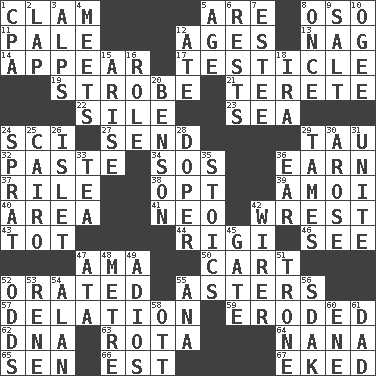 ACROSS 1. Dollar (slang) 5. "We ___ not amused" (Victoria) 8. Bear (Spanish) 11. Diluted with white 12. Grows older 13. Tired old horse 14. Seem 17. A testis 19. Disco prop 21. Cigar-shaped 22. Drop; flow; fall 23. Ocean 24. _-fi 27. Transmit 29. The 19th letter of the Greek alphabet 32. Thick mixture 34. Distress signal 36. Merit 37. Cause heat under the collar 38. Elect 39. Mine, in Marseilles 40. Length times width 41. Modern: prefix 42. Obtain by seizing forcibly or violently 43. Small child 44. Swiss mountan, "Queen of the Mountains" 46. Perceive with the eye 47. Housemaid (var.) 50. Heavy open wagon 52. Declaimed 55. Michaelmas daisies 57. Accusation by an informer 59. Eaten away 62. Heredity factor (abbr.) 63. Round or rotation of duties 64. Nanny 65. Elected rep. 66. Eastern Standard Time (abbr.) 67. Made supply last DOWN 1. Tax preparer (abbr.) 2. Infant locale 3. High mountains 4. Confronts 5. Personal question 6. Musical pauses 7. First name in cosmetics 8. At one time in the past 9. Table seasoning 10. Double curve, resembling the letter S 12. Had dinner 15. Get up 16. Hero or heavy, e.g. 18. Lyricist Gershwin 20. Gillaume's butler role 24. Small fatty European fish 25. Capital of Egypt 26. Small island 28. Drug addict 29. Domesticates 30. Came up 31. Join together 33. Beverage made from leaves 35. Unemotional ones 36. Hearing organ 42. One who wires 45. Yard entry 47. _ moment's notice (2 wds.) 48. Distance measurement (Brit.) 49. Goodbye (Sp.) 51. Marketplace scale 52. Probability 53. French philosopher Descartes 54. ____ Jay Lerner 55. Santa ___, CA 56. Neighbor of Neb. 58. Baseball player Mel 60. Compass dir. 61. June honoree