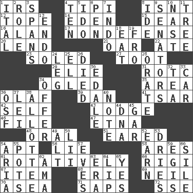ACROSS 1. Big collection agency 4. Native american tent (variation) 8. Is not 12. Drink excessively 14. Locale of original sin 15. Letter starter 16. ____ Jay Lerner 17. Unrelated to defense, as in spending 20. Grant temporary use of 21. Rowing implement 22. Had dinner 23. Having a sole or soles 27. A blast of a horn 29. Writer Wiesel 31. College mil. group 34. Stared 35. Length times width 36. Norwegian king 39. Daniel's nick name 41. Russian ruler of old 42. Itself 43. Inn 46. Do some clerical work 47. Inactive volcano in Sicily 48. Relating to the mouth 51. Having ears or earlike features 54. Fitting 56. Falsehood 58. Ancient Greek god of war 61. Producing rotation 66. Swiss mountan, "Queen of the Mountains" 67. A whole individual unit 68. One of the Great Lakes 69. Famous astronaut Armstrong 70. Toward the sea 71. Plant excrements 72. Compass dir. DOWN 1. Slanted text style (abbr.) 2. Hero or heavy, e.g. 3. Connects, as a bridge 4. "___ Little Indians" 5. Wedding promise 6. Writing instrument 7. Southeast Asian peninsula 8. Binary compound 9. Legislators 10. Political cartoonist Thomas 11. Relationship diagram 13. Inside; within (prefix) 18. Consume 19. From 24. Part of a journey 25. Pipe bend 26. Passed on 28. Speak pompously 30. Peak District village in England 32. Beverage made from leaves 33. Automobile 34. Auction bid 36. Order of Saint Francis (abbr.) 37. Luau accessory 38. One to whom something is allotted 40. Musical sound 44. Heredity factor (abbr.) 45. Slender fish 49. The first octave above the treble staff 50. Cards in a Roman deck? 52. Merit 53. Frees from moisture 54. Roberta Peters solo 55. Plant holders 57. Nights before holidays 59. The front part of a cuirass 60. Drop; flow; fall 62. Housemaid (var.) 63. Period 64. Mouth edge 65. It is so
