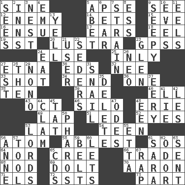 ACROSS 1. Trig term 5. Domed church section 9. Observe 12. Foe 14. Wagers 15. Night before a holiday 16. Follow as a consequence or result 17. Hearing organs 18. Snakelike fish 19. Fast jet (abbr.) 20. A period of five years 23. Global Positioning Systems (abbr.) 24. Otherwise 25. In an inward manner 27. Inactive volcano in Sicily 30. Begley and Asner 32. Born 33. Guess 34. Tear apart 36. Single 38. "___ Little Indians" 39. Actress Charlotte 40. Pipe bend 43. Sep. follower 46. Grain storage tower 48. One of the Great Lakes 49. Pet locale 51. Directed 52. Snake ____ (dice throw) 53. Thin strip of wood or metal 54. Adolescent 56. Tiny particle 58. Most capable 61. Distress signal 64. And not 65. Algonquian 66. Swap 68. Allow head to fall sleepily 69. Stupid person 70. Composer Copland 71. Raised railways 72. Fast planes 73. Component DOWN 1. Observes 2. Lodging establishments 3. Egg locale 4. Australian flightless bird 5. Collude with 6. Lightbulb-shaped fruit 7. Put through a sieve 8. Double-curved letter 9. Oozy 10. Nights before holidays 11. Snakelike fish 13. Shout 21. One who makes use of a thing 22. Spring feasts 23. Small, secluded valley 24. Ingest 26. Modern: prefix 27. Eastern Standard Time (abbr.) 28. Definite Article 29. Words to Nanette 31. Slow-paced one 35. Keyboard key 37. Suggestive of the supernatural 41. Falsehood 42. French article 44. Burrowing marine mollusk 45. Make lace 47. Lyric poems 48. Car or cant ending 50. N Egypt peninsula 53. Nobles 55. Singer James 56. Singer Murray 57. Utensil 59. Waist strap 60. Allows 61. "Two Mules for Sister ____" 62. Scent 63. Transmitted 65. Music discs 67. Hit sharply and swiftly