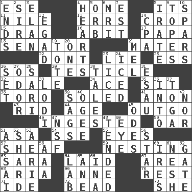 ACROSS 1. Compass dir. 4. Residence 8. ___ a Wonderful Life 11. The longest river in the world 13. Blunders 14. Riding implement 15. To draw with force 16. "This won't hurt ____!" 17. Dad 18. Elected representative 21. Mother 22. Do not 23. Whopper 25. Curvy letter 26. Distress signal 29. A testis 32. Peak District village in England 34. Adept person 35. Be seated 38. "Corrida" creature 39. Having a sole or soles 41. Soon (poet.) 43. To free from 44. Grow older 45. Money paid out 46. Consumed 50. Boat paddle 51. White ___ sheet 54. Compass dir. 55. Sight organs 57. Archer's quiver 59. Nestling 63. "Two Mules for Sister ____" 64. Put down 67. Length times width 68. Operatic vocal solo 69. Singer Murray 70. State of inaction 71. Binary compound 72. Necklace unit 73. A female animal or person DOWN 1. Conclusions 2. Beget 3. Flair 4. Centers of feelings and intuitions 5. Globe 6. Medical imaging device (abbr.) 7. Eastern Standard Time (abbr.) 8. Feeling or showing extreme anger 9. Drinks excessively 10. Practice fights 12. Mild oath 14. Accounting whiz (abbr.) 19. Carryall 20. Single 21. Cartoonist voice _ Blanc 23. Louse (plural) 24. On the rocks 26. Arrange properly for use 27. Aroma 28. Indian skirt 30. Lies 31. Son of Isaac 33. Farming town in central California 36. To the inside or interior of 37. Ancient Roman robe 39. Settles 40. Double curve, resembling the letter S 42. And not 45. Lyric poems 47. Overdraft (abbr.) 48. Watched over 49. Sight organ 51. Slender Brazilian palm 52. Broken piece 53. Nest on high 56. Play the lead 58. American Automobile Association (abbr.) 60. Angers 61. Delicate 62. Yard entry 64. Experiment locale 65. A saturated hydrocarbon 66. _ tizzy (2 wds.)