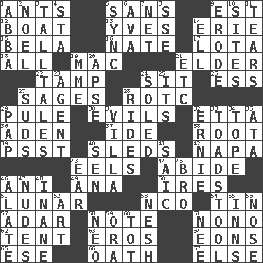 ACROSS 1. Pismires 5. Without 9. Eastern Standard Time (abbr.) 12. Water vessel 13. Jacques Cousteau's middle name 14. 4th largest of the Great Lakes 15. Actor Lugosi 16. Nathan's nickname 17. Globular water bottle used in Asia 18. 100% 19. Apple computer (short form) 21. A person who is older than you are 22. Pack (down) 24. Be seated 26. Double-curved letter 27. Gurus 28. College mil. group 29. Whimper 30. Vices 32. Singer James 36. Arabian gulf 37. Binary compound 38. Carrot, for example 39. Inconspicuous attention getter 40. Bobsleighs 42. California wine valley 43. Snakelike fish 44. Stay 46. Black tropical American cuckoo 49. Santa ___, CA 50. Angers 51. Type of eclipse 53. Non-commissioned officer (abbr.) 54. Metal container 57. The sixth month of the Jewish calendar 58. Make mention of 61. Words to Nanette 62. Portable shelter 63. Greek god of love 64. Immeasurably long periods of time 65. Compass dir. 66. Pledge 67. Otherwise DOWN 1. Swedish rock group 2. Christmas carol 3. Baron Munchausen's specialties 4. R.R. building 5. Synchronize (abbr.) 6. Actress Gardner 7. Remaining after all deductions 8. Compass dir. 9. Eat (away) 10. Settings 11. Separates forcefully 14. Pipe bend 19. Madame (abbr.) 20. Domed church section 21. And so on (abbr.) 23. Representative 24. Having a sole or soles 25. It is 27. Soap bubbles 28. Amusement-park features 29. Infant food 31. Country estate 32. Bert's buddy 33. Inedible or poisonous agaric 34. Drink excessively 35. _ moment's notice (2 wds.) 40. Elected rep. 41. Ketch in the Levant 43. Ewer handle 45. Sis' sibling 46. Having winglike extensions 47. Unclothed pictures 48. Silly 52. Nonscientific branch of learning 53. Soft 55. Lodging establishments 56. Sense of smell 58. Modern: prefix 59. Mouth or opening 60. Small child 61. Born