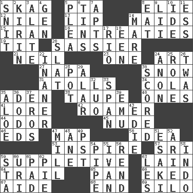 ACROSS 1. Heroin 5. Parent Teacher Assoc. 8. Writer Wiesel 12. The longest river in the world 13. Mouth edge 14. Women servants 15. SW Asia republic 16. Pleas 19. Teat (slang) 20. More disrespectful 21. Famous astronaut Armstrong 23. Single 24. Nonscientific branch of learning 27. California wine valley 30. Overwhelm 31. Ringlike coral islands and reefs 34. Root beer relative 35. An important port of Yemen 38. Grayish beige 40. Singles 41. Old wives' tales, e.g. 42. Wanderer 44. Scent 45. Unadorned 46. Begley and Asner 47. Atlas unit 50. It may be bright or harebrained 53. Motivate 57. _ Lanka 59. Supplementary 63. (Had) reclined 64. Go after with the intent to catch 65. Baking dish 66. Made supply last 67. Helper 68. Conclude 69. Grain storage tower DOWN 1. In a ____ (agitated or irritated) 2. Japanese brewing company 3. Having winglike extensions 4. Commissioned mil. rank 5. Entreaty 6. Canisters 7. Flats, for short 8. Consume 9. Cards in a Roman deck? 10. Binary compound 11. Double-curved letter 14. Female horse 17. _ de Janeiro 18. Car or cant ending 20. Narrow board 22. More empty; more void 24. At once, immediately (arch.) 25. Hero or heavy, e.g. 26. It was, poetically 28. Cooking vessel 29. Having or resembling wings 30. Tallied 32. Nilotic language 33. Connect, as a bridge 35. Medicinal plant 36. Texas town _ City 37. Greek god of love 39. Australian flightless bird 43. Singer Brickell 47. Place where flour is made 48. A saturated hydrocarbon 49. Pacific Standard Time (abbr.) 51. 1973 Nobel Price Winner (Physics) Leo 52. Satellite of Uranus 54. Corncob 55. "Terrible" tsar 56. Tear apart 58. Southeast Asian peninsula 59. R.R. building 60. RI univ. 61. Groovy apt. 62. Sliced dessert 63. French article