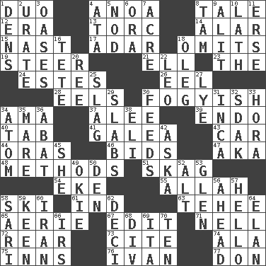 ACROSS 1. Superhero pair 4. Small Philippine buffalo 8. Lie 12. Epoch 13. Torque (variant) 14. Having or resembling wings 15. Political cartoonist Thomas 17. The sixth month of the Jewish calendar 18. Leaves out 19. Guide 21. Pipe bend 23. Definite Article 24. _____ Park, CO 26. Snakelike fish 28. Snakelike fish 30. Out of fashion; old fashioned 34. Nursemaid (var.) 37. Toward shelter 39. Inside; within (prefix) 40. Bar bill 41. An organ shaped like a helmet 43. 4-wheeled motor vehicle 44. Mouths or openings 46. Auction offers 47. Alias (abbr.) 48. Modes 51. Heroin 54. Supplement with great effort 55. Assad's deity 58. What Jean-Claude Killy likes to do 61. Indiana (abbr.) 63. Giggle 65. Nest on high 67. Prepare for publication 71. 1994 drama film starring Jodie Foster 72. Posterior 73. Quote 74. According to 75. Restaurants 76. _ the terrible 77. Spanish title DOWN 1. Habitations of wild animals 2. A salt of uric acid 3. Fertile tracts in a desert 4. _ moment's notice (2 wds.) 5. Allow head to fall sleepily 6. Mouth or opening 7. Land measure 8. Scottish cap 9. Came down and settled, as after flight 10. Thin strip of wood or metal 11. Celtic language 16. Wig 18. Cassini of fashion 20. To separate or throw off 22. Lion 25. Volcanic refuse 27. Sodium hydroxide 29. Thick slices 30. Eats 31. South American Indian 32. Neighbor of Neb. 33. Israeli folk dance 34. Smallest unit of an element 35. Female horse 36. Blind as ____ 38. Biblical high priest 42. "____ silly question..." 45. A female animal or person 49. Migrant worker of the '30s 50. Lair 52. The first octave above the treble staff 53. Small, secluded valley 56. Having the leading position 57. Phone greeting 58. Indian skirt 59. Peachy ____! 60. SW Asia republic 62. Tenth: prefix 64. Flair 66. Big collection agency 68. HTML Container Element 69. Call ___ day 70. "___ Little Indians"
