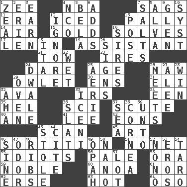 ACROSS 1. Last letter of the English alphabet 4. Basketball assoc. 7. Sinks 11. Epoch 12. On the rocks 13. Chummy 14. Wind 15. Gilt 16. Finds the solution 17. Soviet premier 1918-24 19. Helper 21. Pull behind 23. Angers 24. Have the gumption 25. Grow older 26. Informal term for the mouth 29. A small or young owl 30. Followers of ems 31. Biblical high priest 32. Actress Gardner 33. Big collection agency 34. Car or cant ending 35. Cartoonist voice _ Blanc 36. _-fi 37. Scutum 40. One (Scot) 41. Area sheltered from the wind 42. Immeasurably long periods of time 43. Examine hastily 45. Nonscientific branch of learning 46. Decision 51. Music written for nine 55. Foolish or stupid persons 56. Light colored 58. Mouth or opening 59. Impressive in appearance 60. Small Philippine buffalo 61. And not 62. Celtic language 63. Being at a high temperature 64. Bear (Spanish) DOWN 1. Ardor 2. 4th largest of the Great Lakes 3. Merit 4. Non-commissioned officer (abbr.) 5. Actor Lugosi 6. Does sums 7. Table seasonings 8. Inventor's middle name 9. Small, secluded valley 10. System (abbr.) 12. Refuse to acknowledge 13. Introduce or present, as a question 16. Founders of families 18. Slanted text style (abbr.) 20. Omens 22. Soggy 24. A sleeping potion; an opiate (poet.) 25. Nest on high 26. Confronts 27. Toward shelter 28. Acquire through effort 29. Baking chamber 32. Nanny (var.) 33. Ancient Celtic tribe of eastern Britain 36. Narrow boards 37. Ocean 38. Pupil covering 39. To (old English) 43. Took without asking 44. Quote 46. Trig term 47. Aroma 48. Chest bones 49. Brightly colored fish 50. Billionth: prefix 52. Words to Nanette 53. Greek god of love 54. Edible starchy tuberous root 57. Car dealer's back yard