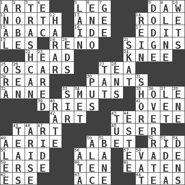 ACROSS 1. Johnson of "Laugh-In" 5. Part of a journey 8. Obsolete 11. Compass direction 13. One (Scot) 14. Hero or heavy, e.g. 15. Phillipine bananalike plant 16. Binary compound 17. Prepare for publication 18. French article 19. Western Nevada city 21. Omens 22. Froth on beer 24. Leg joint 25. Motion picture awards 27. Afternoon social gathering 29. Hitchcock's "____ Window" 30. Leg coverings 32. Singer Murray 33. Particles of soot 35. Hollow 39. Frees from moisture 41. Baking chamber 42. Tate display 43. Cigar-shaped 45. Small pie 48. One who uses or employs something 49. Nest on high 50. Collude with 52. To free from 55. Put down 56. According to 57. Dodge 59. Celtic language 60. Nine, plus one 61. Ingested 62. Compass dir. 63. Adept person 64. Afternoon social gatherings DOWN 1. Of or related to the anus 2. Loose flowing garment 3. File 13 4. And so on (abbr.) 5. (Had) reclined 6. Inside; within (prefix) 7. Unit of force equal to gravity 8. Evade 9. Place in a line 10. Soaks 12. Ethiopian city, capital of Harari 14. It's straight from the horse's mouth 20. Begley and Asner 21. Three-handed card game 23. Having ears or earlike features 25. Mouth or opening 26. Elected rep. 27. Make lace 28. Followers of ems 30. Product of festering 31. Dinah or Pauly 33. Title for a knight 34. Was introduced to 36. Make much ado about nothing 37. Allow 38. Compass dir. 40. Pace 43. Third day of the wk. 44. First name in cosmetics 45. Lacerates 46. Originate 47. Travel on an animal 49. Toward shelter 50. Actor Baldwin 51. Object of repulsion 53. It may be bright or harebrained 54. Habitations of wild animals 56. "One Day ___ Time" 58. Large container