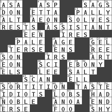 ACROSS 1. White ___ sheet 4. Cleo's killer 7. Droops 11. Spanish title 12. Singer James 13. Chummy 14. The first octave above the treble staff 15. Period of immesurable duration 16. Finds the solution 17. Musical pauses 19. Helper 21. Car or cant ending 23. Angers 24. Diluted with white 25. Personal question 26. Set 29. Laconic 30. Followers of ems 31. To sift 32. Male child 33. Big collection agency 34. Tate display 35. Period of immesurable duration 36. _-fi 37. Black 40. Raised railways 41. Area sheltered from the wind 42. Table seasoning 43. Glance over 45. Pipe bend 46. Making a chance decision by using lots 51. Clothes sense 55. Foolish or stupid persons 56. Tennis shots 58. Possessed 59. Impressive in appearance 60. Small Philippine buffalo 61. Conclusion 62. Celtic language 63. Egg _ yung 64. Like a shrinking violet DOWN 1. The sixth month of the Jewish calendar 2. Flatfish 3. Pismires 4. Had dinner 5. Portico 6. Zero-star reviews 7. Table seasonings 8. Inventor's middle name 9. Small, secluded valley 10. System (abbr.) 12. Artist's stands 13. Airs 16. Titles for men of rank and authority 18. Separate forcefully 20. Signals 22. Born 24. Actor Sean's family 25. Nest on high 26. Let have 27. Suggestive of the supernatural 28. Allow 29. Utensil 32. Observe 33. Ancient Celtic tribe of eastern Britain 36. Narrow boards 37. Compass dir. 38. Greek mezzo-soprano Agnes 39. Rounded earthenware pot or jar 43. Fur scarf 44. Quote 46. Trig term 47. Scent 48. Teases 49. Norwegian king 50. Words to Nanette 52. "______ My Girl" (Turtles hit) 53. Hyperbolic tangent 54. Whirlpool 57. Sometimes accompanies a hiss