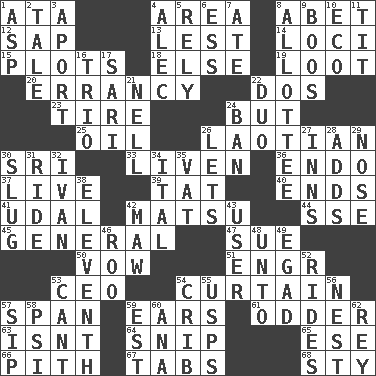 ACROSS 1. "One Day ___ Time" 4. Type of rug 8. Collude with 12. Plant excrement 13. For fear that 14. Event scenes 15. Schemes 18. Otherwise 19. Plunder 20. The state or an instance of erring 22. Two (Sp.) 23. Become fatigued 24. Yet 25. Petroleum 26. Of or relating to Laos or its people 30. Indian title of respect (Mr.) 33. Make or become more lively 36. Inside; within (prefix) 37. Moving, as bait 39. Make lace 40. Extremities 41. Allodial 42. Taiwanese island in East China Sea 44. Compass dir. 45. Commissioned military rank 47. Take to court 50. Solemn pledge 51. Engineer (abbr.) 53. Corporate head (abbr.) 54. Window treatment 57. Connect, as a bridge 59. Hearing organs 61. More peculiar 63. Is not 64. Sever or remove by pinching or nipping 65. Compass dir. 66. Heart or essence 67. Bar bills 68. Filthy place DOWN 1. Cleo's killer 2. Story 3. To the left, to Queeg 4. Actor Baldwin 5. Have confidence or faith in 6. Curvy letter 7. Had dinner 8. One to whom something is allotted 9. Scornful sounds 10. Environmental prefix 11. Teat (slang) 16. Musical group of three 17. Indian skirt 21. 1994 drama film starring Jodie Foster 22. Superhero pair 24. Forbid 26. Allows 27. Lodging establishments 28. Does sums 29. Sense of smell 30. A hard, heavy blow 31. Travel on or in a vehicle 32. _ the terrible 34. Slanted text style (abbr.) 35. Large container 38. Veterans Day date 42. Informal term for the mouth 43. One who uses or employs something 46. Friend of Pooh 48. To (old English) 49. Mild oath 52. Amusement-park features 53. Patter 54. Baby bed with high sides 55. United States Postal Service (abbr.) 56. Egg locale 57. Small drink 58. Air pressure measure (abbr.) 59. Eastern Standard Time (abbr.) 60. Santa ___, CA 62. Marina Del _, California