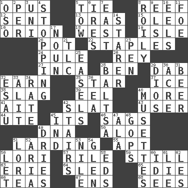 ACROSS 1. Musical composition 5. Standoff 8. Coral ridge 12. Transmitted 13. Mouths or openings 15. Butter sub 16. Constellation of myth 18. Compass direction 19. Small island 20. Plant holder 22. Paper fasteners 24. Whine 26. Marina Del _, California 27. South American Indian 28. Benjamin's nick name 29. Apply (a substance) by light strokes 32. Merit 35. Play the lead 37. Frozen water 38. Volcanic refuse 39. Snakelike fish 40. Greater amount 41. Small island 42. Narrow board 43. One who uses or employs something 44. Shoshoni 45. It is 46. Settles 49. Heredity factor (abbr.) 50. _ vera 51. Preparing or cooking with lard 55. Fitting 56. Australian parrot (variant) 57. Cause heat under the collar 59. Free from disturbance or agitation 63. 4th largest of the Great Lakes 64. Downhill vehicle 65. Singer Brickell 66. Afternoon social gatherings 67. Followers of ems 68. Observes DOWN 1. Bear (Spanish) 2. For each 3. University (slang) 4. Ceasing 5. Pull behind 6. Angers 7. Compass direction 8. Agitated, as a liquid 9. Otherwise 10. Snakelike fish 11. Enemy 14. A viewer who gazes fixedly 17. Part of speech 21. Affectionate concern, for short 23. Animal enclosure 25. Artist's stands 28. Greek mezzo-soprano Agnes 29. "Vaya con ____" 30. Measure of real estate 31. Fermented drink made from hops 32. He sold his birthright 33. Came down and settled, as after flight 34. Pace 36. Beverage made from leaves 40. French bagpipes 42. Flight of steps 45. Working for oneself (abbr.) 47. In the manner of 48. Republicans 49. Frees from moisture 51. Old wives' tales, e.g. 52. Operatic vocal solo 53. Mediterranean tributary 54. Small, secluded valley 56. Allow 58. Begley and Asner 60. Binary compound 61. Falsehood 62. French article