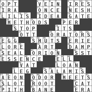 ACROSS 1. Choose 4. Distinctive style or manner 8. Angers 12. Lyricist Gershwin 13. At one time in the past 14. Delicate 15. Ms. Damita and namesakes 18. It may be bright or harebrained 19. Yard entry 20. Modes 22. For each 23. Constrict 24. It is 25. Baseball player Mel 26. Speakers 30. Ovum 33. Obscenities 36. 4th largest of the Great Lakes 37. Old wives' tales, e.g. 39. Tate display 40. Moist 41. Lick closed 42. Constellation of myth 44. Fast jet (abbr.) 45. Center 47. Pipe bend 50. Large container 51. Grant temporary use of 53. Part of a journey 54. Deli grouping 57. A really long time 59. Aroma 61. Confronts 63. Notch 64. Carrot, for example 65. Domesticated feline 66. Heart or essence 67. Object of repulsion 68. Period DOWN 1. Lubricate 2. Demure 3. Falsehoods 4. Nothingness 5. Conclusions 6. Frozen water 7. Teachers' org. 8. Consumed 9. Bring up, as a child 10. Eastern Standard Time (abbr.) 11. A female animal or person 16. "Tell ____ the Marines!" 17. Opportunity 21. Chooses 22. Parent Teacher Association (abbr.) 24. Big collection agency 26. "Beetle Bailey" pooch 27. Mouths or openings 28. Basketball hoops 29. Back-to-school mo. 30. Otherwise 31. Leaves 32. Pate de foie ____ 34. Female horse 35. RI univ. 38. Veterans Day date 42. Sep. follower 43. 1994 drama film starring Jodie Foster 46. Tired old horse 48. Rich soil 49. Unable to walk 52. Sibling's daughter 53. Spoils 54. Within a short period 55. Johnson of "Laugh-In" 56. Play the lead 57. Cleo's killer 58. Connecticut Ivy Leaguer 59. Globe 60. ___ good deed 62. R.R. building