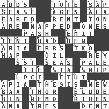 ACROSS 1. Sums up 5. Haul 9. Plant excrement 12. Gospel singer Marvin 14. Matures 15. Insect wing 16. Having ears or earlike features 17. Monthly bill 18. Electrically charged atom 19. "We ___ not amused" (Victoria) 20. Slept 23. Washington bills 24. Romantic infatuation 25. Give off 27. Portable shelter 30. Possessed 32. Lair 33. Roberta Peters solo 34. Blunders 36. Ring climax 38. Atlas unit 39. Lubricate 40. Marina Del _, California 43. Fast jet (abbr.) 46. Oceans 48. Light colored 49. Make a knot 51. R.R. building 52. Sever or remove by pinching or nipping 53. Event scenes 54. Needle holder 56. Capital of Western Samoa 58. College paper 61. ___ Haven, CT 64. Sound made by sheep 65. Son of Odin 66. Dodge 68. Storage container 69. San ____ (Riviera town) 70. Amusement-park features 71. Santa ___, CA 72. Angers 73. Gouge DOWN 1. At sea 2. Letter starter 3. Have the gumption 4. Compass dir. 5. Canvas cover 6. Double curve, resembling the letter S 7. Looked after 8. Eastern Standard Time (abbr.) 9. Virtuous person 10. _ vera 11. Baking dishes 13. Pulitzer Prize-winning author Ferber 21. American tennis player Robert 22. N Egypt peninsula 23. Pig sound 24. Parent Teacher Assoc. 26. Was introduced to 27. Scottish cap 28. Period 29. Cuts off 31. Frees from moisture 35. Chalkboards 37. Northwest Algerian city 41. Biblical high priest 42. Slangy assent 44. Portico 45. Nervous spasm 47. Suttee (variant) 48. Air pressure measure (abbr.) 50. One or the other 53. Climbing, woody, usually tropical vines 55. One who uses or employs something 56. Swedish rock group 57. Ache 59. Dwelling 60. Greek god of love 61. Unadorned 62. Locale of original sin 63. 270 degrees 65. Three (prefix) 67. Hat (slang)