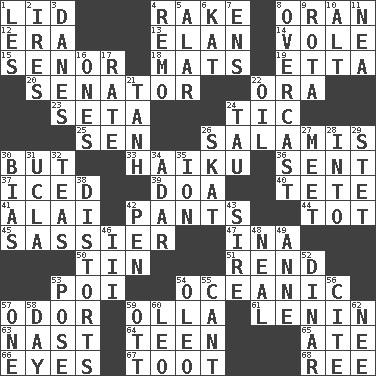 ACROSS 1. Flaplike covering 4. Immoral or dissolute person 8. Northwest Algerian city 12. Epoch 13. Enthusiasm 14. Short-tailed, large-bodied rat 15. Sir (Sp.) 18. Floor protectors 19. Singer James 20. Legislator 22. Mouth or opening 23. Stalk of a moss capsule 24. Nervous spasm 25. Elected rep. 26. Deli grouping 30. Yet 33. Japanese verse 36. Transmitted 37. On the rocks 39. ___ good deed 40. False hair 41. Jai _ 42. Leg coverings 44. Small child 45. More lively and spirited 47. _ tizzy (2 wds.) 50. Metal container 51. Tear apart 53. Luau course 54. Pertaining to the sea 57. Aroma 59. Spanish pot 61. Soviet premier 1918-24 63. Political cartoonist Thomas 64. Adolescent 65. Had dinner 66. Sight organs 67. A blast of a horn 68. To separate or throw off DOWN 1. French article 2. Angers 3. Natives or inhabitants of Denmark 4. San ____ (Riviera town) 5. Having or resembling wings 6. Krazy ___ of comics 7. Followers of ems 8. Cloudy 9. Round or rotation of duties 10. Keyboard modifier key 11. Teachers' org. 16. Washington bills 17. Pace 21. Hyperbolic tangent 22. Petroleum 24. The 19th letter of the Greek alphabet 26. Three-handed card game 27. Rendezvous 28. To the inside or interior of 29. Proofreading order 30. Prejudice 31. Southern CA. univ. 32. Afternoon social gatherings 34. The sixth month of the Jewish calendar 35. Electrically charged atom 38. What propaganda does 42. Fenced enclosure 43. Male parent of an animal 46. One more than two 48. Anneal 49. Singer Murray 52. Middle Eastern gold or silver currency 53. Airs 54. Margarine 55. Patter 56. Quote 57. Single 58. 24 hours 59. Baseball player Mel 60. Lion 62. Born