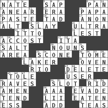 ACROSS 1. Nathan's nickname 5. Plant excrement 8. Baking dish 11. Approach 13. Period 14. Dad 15. Thick mixture 16. Small boy 17. At once, immediately (arch.) 18. Keyboard modifier key 19. Kill 21. Extremist 22. "Tell ____ the Marines!" 24. For fear that 25. Buttonhole 27. Call ___ day 29. Table seasoning 30. Parts of speech 32. Length times width 33. Biscuitlike quick bread 35. Heavy book 39. Member of a famous L.A. basketball team 41. Baking chamber 42. _ de Janeiro 43. Keyboard key 45. Lacquered or enameled metalware 48. One who makes use of a thing 49. All-night dance parties 50. Notch 52. To free from 55. So be it 56. American Automobile Association (abbr.) 57. Elude 59. Be inclined (to) 60. Cards in a Roman deck? 61. Ingested 62. Double-curved letter 63. Increase 64. Afternoon social gatherings DOWN 1. California wine valley 2. Of or related to the anus 3. A testis 4. Consume 5. Bristle 6. Like ___ of sunshine 7. Groovy apt. 8. Leg coverings 9. To the left, to Queeg 10. Nanny 12. Musical pauses 14. Diluted with white 20. Car dealer's back yard 21. ____ Bator, Mongolia 23. "_____ Recall" 25. White ___ sheet 26. Auto 27. Electrically charged atom 28. Third day of the wk. 30. Not either 31. Fur scarf 33. What Jean-Claude Killy likes to do 34. Corporate head (abbr.) 36. Make much ado about nothing 37. Was introduced to 38. Compass dir. 40. Ancient Greek god of war 43. Superhero pair 44. First name in cosmetics 45. Makes less strong or intense 46. Baking chambers 47. Grant temporary use of 49. Assign a rank or rating to 50. Stated 51. Put down 53. The content of cognition 54. Lairs 56. According to 58. Large container