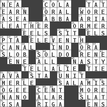 ACROSS 1. Teachers' org. 4. Root beer relative 8. Make lace 11. Merit 13. Of the mouth 14. Had on 15. Toward the sea 16. Swedish rock group 17. Roberta Peters solo 18. Cordwainer's material 21. Abalone 22. Snakelike fish 23. Be seated 25. Raised railways 26. Parent Teacher Assoc. 29. Veterans Day date 32. Lessep's creation 34. Working for oneself (abbr.) 35. Mouth or opening 38. Oscar Madison type 39. Twentieth part of a lira 41. French philosopher Descartes 43. Compass dir. 44. Everything 45. Thoroughly unpleasant 46. Copy Pinocchio 50. Standoff 51. Actress Gardner 54. R.R. building 55. A single undivided whole 57. Haggard of country music 59. Deli grouping 63. Double curve, resembling the letter S 64. Penny 67. Greater amount 68. Billionth: prefix 69. Having or resembling wings 70. Narrow board 71. Girls' org. (abbr.) 72. Capital of Latvia 73. Followers of ems DOWN 1. Be tempered by heat 2. Relaxation 3. Length times width 4. Unrefined 5. Globe 6. Experiment locale 7. According to 8. Singer Mel 9. Satellite of Uranus 10. Pulls into pieces 12. Nathan's nickname 14. Armed conflict 19. The bottom of a shoe or boot 20. Pipe bend 21. Baseball player Mel 23. Transmit 24. _ china 26. Personal Computers (abbr.) 27. Story 28. At once, immediately (arch.) 30. Country residence 31. Israeli folk dance 33. Collude with 36. Repose 37. Against 39. Table seasoning 40. Water jar 42. Sight organ 45. Famous astronaut Armstrong 47. Compass dir. 48. A period of five years 49. _ tizzy (2 wds.) 51. Amid 52. Viva Las _ 53. Sports stadium 56. Scottish caps 58. Lion 60. Undercover agent 61. SW Asia republic 62. Arranges properly for use 64. Automobile 65. Biblical high priest 66. Tired old horse