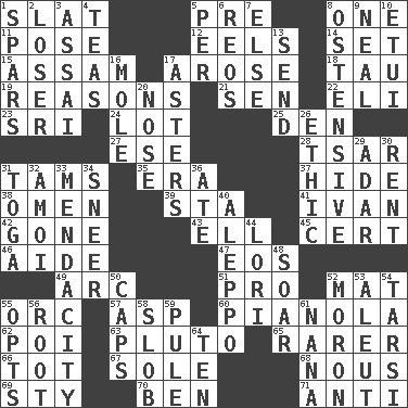 ACROSS 1. Narrow board 5. Before (prefix) 8. Single 11. Airs 12. Snakelike fish 14. Arrange properly for use 15. Indian state 17. Came up 18. The 19th letter of the Greek alphabet 19. Thinks logically 21. Elected rep. 22. Connecticut Ivy Leaguer 23. _ Lanka 24. Car dealer's back yard 25. Lair 27. Compass dir. 28. Russian ruler of old 31. Scottish caps 35. Period 37. Flintstone garb 38. Sign of things to come 39. R.R. building 41. "Terrible" tsar 42. Went 43. Pipe bend 45. Foregone conclusion 46. Helper 47. Greek goddess of the dawn 49. Curve 51. Adept person 52. Floor protector 55. The grampus (Milton) 57. Cleo's killer 60. Player piano 62. Luau course 63. Greek god of the underworld 65. More valued for its uncommonness 66. Small child 67. Not divided or shared with others 68. Common sense 69. Filthy place 70. Benjamin's nick name 71. Against DOWN 1. Practice fights 2. Failure 3. Slender Brazilian palm 4. Afternoon social gatherings 5. For each 6. Vintage cars 7. Otherwise 8. Clearly or manifestly demonstrative 9. Anneal 10. Needle case 13. Post 16. Undercover agent 17. Michaelmas daisies 20. Olfactory organ 26. Principle of right and wrong 29. The sixth month of the Jewish calendar 30. Monthly bill 31. Ancient Roman robe 32. Mine, in Marseilles 33. Ananias' fault 34. Scornful expression 36. Had dinner 40. City in Syria 44. Australian parrot (variant) 48. Fly high 50. Balmoral and tarboosh 52. Person of subnormal intelligence 53. Native American of Southwest Alaska 54. Tarsus (plural) 55. Chooses 56. Carrot, for example 58. Messy guy 59. Whimper 61. Nanny 64. Nine, plus one