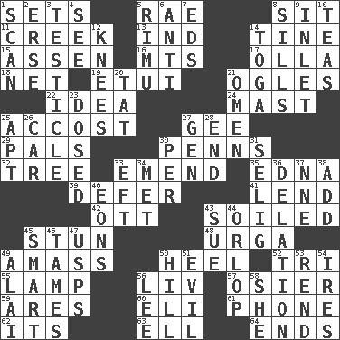 ACROSS 1. Puts into a specified state 5. Actress Charlotte 8. Be seated 11. Small stream 13. Working for oneself (abbr.) 14. Prong on a fork 15. NE Netherlands city 16. Mountains (abbr.) 17. Water jar 18. Remaining after all deductions 19. Needle holder 21. Stares at amorously 22. The content of cognition 24. Vertical spar for supporting sails 25. Buttonhole 27. Turn to the right 29. Friends 30. Actor Sean's family 32. Woody plant 33. Make improvements or corrections to 35. Pulitzer Prize-winning author Ferber 39. Postpone 41. Grant temporary use of 42. Baseball player Mel 43. Dirtied 45. Surprise greatly 48. Capital and largest city of Mongolia 49. Collect or gather 50. Person who is morally reprehensible 52. Three (prefix) 55. Desk light 56. 54 in ancient Rome 57. Flexible twig of a willow tree 59. Ancient Greek god of war 60. Connecticut Ivy Leaguer 61. Give a jingle 62. ___ a Wonderful Life 63. Pipe bend 64. Conclusions DOWN 1. Examine minutely or intensely 2. Celtic language 3. One of the two male reproductive glands 4. Observe 5. Tall New Zealand timber tree 6. Against 7. Begley and Asner 8. Beverly of Met fame 9. An arm off of a larger body of water 10. Beverages made from leaves 12. Leg joints 14. Ancient Roman robe 20. Make lace 21. Sign of something about to happen 23. Administered medicine 25. Fitting 26. Automobile 27. Commissioned military rank (abbr.) 28. Conclusion 30. For each 31. Major League Baseball Commissioner Bud 33. Bank Draft (abbr.) 34. Was introduced to 36. Accusation by an informer 37. Compass dir. 38. Say or write further 40. Immeasurably long periods of time 43. Institute legal proceedings 44. Lowest deck of a ship 45. Don Adams' spy role 46. Corrects by punishment or discipline 47. United States Postal Service (abbr.) 49. Mountain range southwest of Kyrgyzstan 50. Land elevation 51. Morally bad or wrong 53. Tear apart 54. Angers 56. Area sheltered from the wind 58. A female animal or person