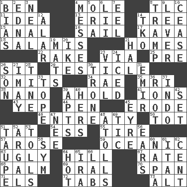 ACROSS 1. Benjamin's nick name 4. Undercover agent 8. Affectionate concern, for short 11. It may be bright or harebrained 13. One of the Great Lakes 14. Relationship diagram 15. Of or related to the anus 16. Travel by water 17. Polynesian shrub of the pepper family 18. Deli grouping 21. Dwellings 22. Immoral or dissolute person 23. By way of 25. Before (prefix) 26. Be seated 29. A testis 32. Leaves out 34. Actress Charlotte 35. Medical imaging device (abbr.) 38. Billionth: prefix 39. Hold, grip (Informal) 41. Charged particles 43. Slangy assent 44. Animal enclosure 45. Wear away 46. Plea 50. Small child 51. Make lace 54. Double-curved letter 55. Hoop that covers a wheel 57. Came up 59. Pertaining to the sea 63. Unsightly 64. Land elevation 67. Assign a rank or rating to 68. Inside of hand 69. Spoken 70. Connect, as a bridge 71. Raised railways 72. Bar bills 73. Keyboard modifier key DOWN 1. Prejudice 2. Pulitzer Prize-winning author Ferber 3. Be tempered by heat 4. Makes clutter 5. Mouth or opening 6. Cards in a Roman deck? 7. Snakelike fish 8. _____ steamer (cargo ship) 9. Crowbar 10. Desist 12. Having or resembling wings 14. Ring climax 19. Floor protectors 20. Eisenhower's nickname 21. Actor Linden 23. Small bottle 24. On the rocks 26. Male offspring 27. "If ____ say so..." 28. Prong on a fork 30. Heavy duty weighing machine 31. Independent ruler or chieftain 33. Drink excessively 36. Carrot, for example 37. _ china 39. Tenement units (abbr.) 40. Possessive pronoun 42. Put into a specified state 45. Jane of fiction 47. Born 48. Ringlike coral islands and reefs 49. Nervous spasm 51. Grayish beige 52. Therefore, facetiously 53. For Whom the Bell _____ 56. Hearing organs 58. Symbol (abbr.) 60. California wine valley 61. Slanted text style (abbr.) 62. Penny 64. Being at a high temperature 65. Retirement account (abbr.) 66. Experiment locale