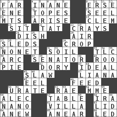 ACROSS 1. Distant 4. Silly 9. Celtic language 13. Compass dir. 14. Drinks excessively 15. Stitch closed the eyes of (a falcon) 16. Mountains (abbr.) 17. Ascend 18. Clement's nick name 19. Be seated 21. Make lace 22. Trading vessels 24. Food container 26. Wind 27. Bobsleighs 29. Riding implement 30. Music written for nine 31. Land 33. Affectionate concern, for short 36. Curve 37. Legislator 40. Friend of Pooh 41. Sliced dessert 42. Rowboat 43. Standard of perfection 45. Cole _ (cabbage dish) 47. Woody, climbing, usually tropical plant 48. Snakelike fish 49. Nourish 50. A salt of uric acid 52. Actress Charlotte 54. Madame (abbr.) 56. Actor Baldwin 57. Eating place 59. Retirement account (abbr.) 61. Billionth: prefix 62. Country residence 63. Flaplike covering 64. Afresh 65. Approach 66. Directed DOWN 1. Opposite of masc. 2. Pismires 3. Dwelling 4. Call ___ day 5. 0 degrees 6. Capital of Western Samoa 7. Egg locale 8. Compass dir. 9. Fortification 10. Have trust in 11. Perceives with the eye 12. Shade tree 20. Event that recurs at intervals 22. Monte _, Las Vegas Hotel/Casino 23. River (Sp.) 25. Fast planes 27. Fastener 28. Australian parrot (variant) 29. Municipality 31. Frozen precipitation 32. Boat paddle 33. Excercise machine 34. Grant temporary use of 35. Root beer relative 38. Peak District village in England 39. Cause heat under the collar 44. South Vietnam president (1954) 45. Manatee 46. Allow 49. Chap (slang) 50. ____ Bator, Mongolia 51. French philosopher Descartes 52. Precipitation 53. Competent 55. 4th largest of the Great Lakes 56. Santa ___, CA 57. Federal power corp. 58. Ewer handle 60. Say or write further