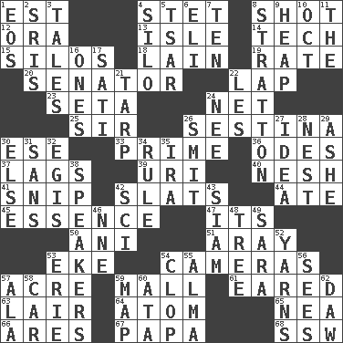 ACROSS 1. Eastern Standard Time (abbr.) 4. Proofreading order 8. Went for two points 12. Mouth or opening 13. Small island 14. Technical work 15. Grain storage towers 18. (Had) reclined 19. Assign a rank or rating to 20. Legislator 22. Pet locale 23. Bristle 24. Fish or hair follower 25. Title for a knight 26. French poetic form 30. Compass dir. 33. A-one 36. Lyric poems 37. Straggles 39. RI univ. 40. Delicate 41. Sever or remove by pinching or nipping 42. Narrow boards 44. Had dinner 45. Substance 47. ___ a Wonderful Life 50. Black tropical American cuckoo 51. Like ___ of sunshine 53. Supplement with great effort 54. Devices for capturing images 57. Measure of real estate 59. Promenade 61. Having ears or earlike features 63. Den 64. Tiny particle 65. Teachers' org. 66. Ancient Greek god of war 67. Dad 68. Compass dir. DOWN 1. Greek goddess of the dawn 2. Indian titles of respect 3. Lies 4. Grain storage tower 5. Russian ruler of old 6. Connecticut Ivy Leaguer 7. "___ Little Indians" 8. Ski resort town in Vermont 9. Pile 10. Sep. follower 11. Definite Article 16. Singles 17. Suttee (variant) 21. Canvas cover 22. French article 24. Born 26. Stricken, poetically 27. The content of cognition 28. Egg locale 29. American tennis player Robert 30. Otherwise 31. Without 32. Armor plate that protects the chest 34. General guideline 35. Retirement account (abbr.) 38. Orators 42. _-fi 43. Thailand, formerly 46. Compass dir. 48. Family _ (genealogy) 49. "Two Mules for Sister ____" 52. Tall tales 53. 4th largest of the Great Lakes 54. Hoof sound 55. _ mater 56. Perceives with the eye 57. Wing 58. Automobile 59. Atlas unit 60. _ moment's notice (2 wds.) 62. Fool