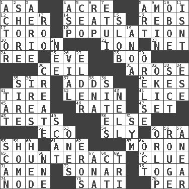 ACROSS 1. White ___ sheet 4. Measure of real estate 8. Mine, in Marseilles 12. "Mermaids" star 14. Theater features 16. Confederate soldiers (slang) 17. "Corrida" creature 18. Census information 20. Constellation of myth 22. Electrically charged atom 23. Remaining after all deductions 24. To riddle 25. First lady 28. Surprise greeting 30. To provide with a ceiling 31. Came up 35. Title for a knight 37. Does sums 40. Supplements with great effort 41. Hoop that covers a wheel 42. Soviet premier 1918-24 44. Louse (plural) 45. Type of rug 46. Pace 47. Put into a specified state 48. Trials 50. Otherwise 52. Environmental prefix 54. Playfully artful 55. Mouth or opening 58. Quiet! 61. One (Scot) 63. Person of subnormal intelligence 65. Frustrate 70. A slight indication 71. So be it 72. Echolocation 73. Ancient Roman robe 74. Thickened enlargement 75. Suttee (variant) 76. For each DOWN 1. Thespian 2. Dinah or Pauly 3. Nest on high 4. Viper 5. Corporate head (abbr.) 6. Hit sharply and swiftly 7. Needle case 8. Nonscientific branch of learning 9. Count _ (2 wds.) 10. Mitch Miller's instrument 11. Is not 13. Friend of Pooh 15. Oscar Madison type 19. Small Philippine buffalo 21. Born 26. Small bottle 27. A person who is older than you are 29. Threatening words 30. Cause to be 32. Migrant worker of the '30s 33. Religious group 34. Compass dir. 35. Father 36. Angers 38. Heredity factor (abbr.) 39. Settings 41. Make lace 43. 1994 drama film starring Jodie Foster 49. Get outta here! 51. Symbol (abbr.) 53. Washington bills 55. Lowest deck of a ship 56. Makeup applied to the cheeks 57. Approach 58. Examine hastily 59. Like (prefix) 60. Became colored 62. Greek god of love 64. Sep. follower 66. Compass dir. 67. Santa ___, CA 68. Feline 69. Three (prefix)