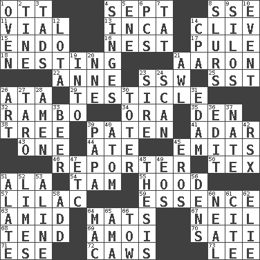 ACROSS 1. Baseball player Mel 4. Back-to-school mo. 8. Compass dir. 11. Small bottle 13. South American Indian 14. 154 in Roman numerals 15. Inside; within (prefix) 16. Egg locale 17. Whimper 18. Snuggling 21. Composer Copland 22. Singer Murray 23. Compass dir. 25. Fast jet (abbr.) 26. _ moment's notice (2 wds.) 29. One of the two male reproductive glands 32. Role for Stallone 34. Mouth or opening 35. Lair 38. Woody plant 39. Eucharist need 41. The sixth month of the Jewish calendar 43. Single 44. Had dinner 45. Gives off 46. News announcer 50. John Ritter's dad 51. In the manner of 54. Scottish cap 55. Parka part 57. Pale purple color 59. Core 63. Among 64. Floor coverings 67. Famous astronaut Armstrong 68. Look after 69. Mine, in Marseilles 70. Suttee (variant) 71. Compass dir. 72. Crow sounds 73. Area sheltered from the wind DOWN 1. Baking chamber 2. Prong on a fork 3. Small boys 4. Burns superficially 5. Compass dir. 6. Personal Computers (abbr.) 7. Make lace 8. Plays smoothly or legato 9. Grain storage towers 10. Happening 12. Globular water bottle used in Asia 14. Tax preparer (abbr.) 19. To the inside or interior of 20. Compass dir. 21. Leather borer 23. Male parent of an animal 24. Examine hastily 26. Tate display 27. Edible starchy tuberous root 28. So be it 30. Carrier 31. Dutch treat 33. Fermented drink made from hops 36. Prepare for publication 37. Nathan's nickname 39. Dad 40. Tiny particle 42. Acura sports coupe 45. Greek god of love 47. And so on (abbr.) 48. College paper 49. Greek goddess of the dawn 51. Having winglike extensions 52. Citrus fruits 53. Place in a line 56. Hiding places for outlaws 58. Say or write further 60. Anneal 61. Quote 62. Writer Wiesel 64. Apple computer (short form) 65. Nanny (var.) 66. Pull behind