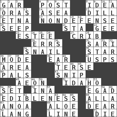 ACROSS 1. Slender fish 4. Mail 8. It may be bright or harebrained 12. Mouths or openings 14. Toward the sea 15. Deli pickle 16. Inactive volcano in Sicily 17. Unrelated to defense, as in spending 20. Ooze 21. R.R. building 22. Unit of force equal to gravity 23. First name in cosmetics 27. Baby bed with high sides 29. Blunders 31. Indian skirt 34. Slow-paced one 35. Play the lead 36. Method 39. Hearing organ 41. United States Postal Service (abbr.) 42. Type of rug 43. Laconic 46. Friends 47. Sever or remove by pinching or nipping 48. Period of immesurable duration 51. Potato state 54. Put into a specified state 56. _ tizzy (2 wds.) 58. Mild oath 61. The property of being fit to eat 66. Silent film actress Nazimova 67. Small Philippine buffalo 68. _ vera 69. Letter starter 70. Austrian-born American filmmaker Fritz 71. Actor's bit 72. Expire DOWN 1. Leaves 2. Johnson of "Laugh-In" 3. Indian princess (variant) 4. Baking dish 5. Bear (Spanish) 6. Elected rep. 7. Small boys 8. Binary compound 9. Empty-headed or silly people 10. Otherwise 11. Toward shelter 13. Plant excrements 18. And so on (abbr.) 19. At a great distance 24. Nine, plus one 25. Period 26. 4th largest of the Great Lakes 28. Come out of 30. Narrow boards 32. Hit sharply and swiftly 33. Big collection agency 34. Gospel singer Marvin 36. Atlas unit 37. Mouth or opening 38. Conveyance 40. Painter Guido (1575-1642) 44. To free from 45. Health resort 49. Petroleum 50. Compass dir. 52. Froth on beer 53. Stared at amorously 54. Lick closed 55. Pulitzer Prize-winning author Ferber 57. Of or related to the anus 59. Jai ____ 60. Have the gumption 62. Paper or plastic container 63. Connecticut Ivy Leaguer 64. Boy, to dad 65. Perceive with the eye