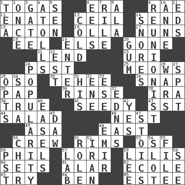 ACROSS 1. Ancient Roman robes 6. Period 9. Actress Charlotte 12. Related on the mother's side 13. To provide with a ceiling 14. Transmit 15. NE Massachussets city 16. Spanish pot 17. Religious women 18. Snakelike fish 19. Otherwise 20. Went 21. Grant temporary use of 23. RI univ. 24. Inconspicuous attention getter 25. Catcalls? 28. Bear (Spanish) 30. Giggle 34. Fastener 35. Infant food 36. Wash lightly 38. Retirement account (abbr.) 39. Loyal 41. Full of seeds 43. Fast jet (abbr.) 44. First course 46. Egg locale 48. White ___ sheet 49. Compass direction 50. Ship's personnel 51. Basketball hoops 53. Order of Saint Francis (abbr.) 56. Silvers or Donahue 57. Australian parrot (variant) 58. Ms. Damita and namesakes 60. Puts into a specified state 61. Having or resembling wings 62. Learning spot: Fr. 63. Attempt 64. Benjamin's nick name 65. First name in cosmetics DOWN 1. Afternoon social gathering 2. At one time in the past 3. Yard entry 4. Ringlike coral islands and reefs 5. Elected rep. 6. Snakelike fish 7. Cause heat under the collar 8. According to 9. One who advocates reunion 10. Queen of England 1702-14 11. Begley and Asner 13. Having a low temperature 14. Sounds asleep 19. Keyboard key 20. Chewing product 22. Eastern Standard Time (abbr.) 24. Teen's desire 26. Armed conflicts 27. Argument over a trivial matter 28. Elects 29. "Two Mules for Sister ____" 31. Part of HMS, perhaps 32. Compass dir. 33. Compass dir. 37. Ferber et al. 40. Artist's stands 42. It is so 45. Simpleton 47. Unemotional ones 49. Independent ruler or chieftain 50. "Mermaids" star 51. Hero or heavy, e.g. 52. SW Asia republic 54. Groove 55. Do some clerical work 56. Pacific Standard Time (abbr.) 57. Experiment locale 58. Area sheltered from the wind 59. Perceive with the eye