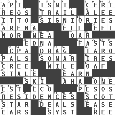 ACROSS 1. Fitting 4. Is not 8. Foregone conclusion 12. Vintage cars 14. Lag or linger behind 16. Toward shelter 17. "Tell ____ the Marines!" 18. Seigniories (variant) 20. Sports stadium 22. Pipe bend 23. Newt 24. Not either 25. Teachers' org. 28. Boat paddle 30. Pulitzer Prize-winning author Ferber 31. Goes without food and/or water 35. Accounting whiz (abbr.) 37. To trail on the ground 40. Pacific island yam 41. Friends 42. Underwater navigation system 44. Angers 45. Algonquian 46. "Death on the ____" 47. Clumsy lout 48. Having lost freshness 50. Merit 52. What Jean-Claude Killy likes to do 54. Wet nurse (var.) 55. Single 58. Eastern Standard Time (abbr.) 61. Environmental prefix 63. Mexican monetary units 65. Homes 70. Highlander 71. Play the lead 72. Allots cards 73. Comfort 74. Hearing organs 75. System (abbr.) 76. To sift DOWN 1. Believer in; advocate of (suffix) 2. Stone: prefix 3. Carrier 4. ___ a Wonderful Life 5. _ Lanka 6. Tired old horse 7. Prong on a fork 8. Automobile 9. Writer Wiesel 10. Coral ridge 11. Trial 13. Boy, to dad 15. _ and Stitch 19. Norwegian king 21. Added to 26. Extremities 27. Composer Copland 29. Food allowance for one day 30. Artist's stands 32. "Two Mules for Sister ____" 33. Not kosher 34. Distress signal 35. Draw slowly or heavily 36. Entreaty 38. Black tropical American cuckoo 39. An organ shaped like a helmet 41. Personal Computers (abbr.) 43. 480, 500 or 516 sheets of paper 49. Supplemented with great effort 51. Hit sharply and swiftly 53. On the rocks 55. Motion picture award 56. Trap for birds or small mammals 57. First name in cosmetics 58. Celtic language 59. Bristle 60. Russian ruler of old 62. Washington bills 64. Compass dir. 66. Big collection agency 67. Island 68. Raised railways 69. Fast jet (abbr.)
