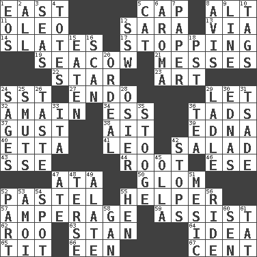 ACROSS 1. 90 degrees 5. Head covering 8. The first octave above the treble staff 11. Butter sub 12. "Two Mules for Sister ____" 13. By way of 14. Chalkboards 17. Discontinuing 19. Manatee 21. Makes clutter 22. Play the lead 23. Nonscientific branch of learning 24. Fast jet (abbr.) 27. Inside; within (prefix) 29. Allow 32. With great haste 34. Curvy letter 36. Small boys 37. Abrupt rush of wind 38. Small island 39. Pulitzer Prize-winning author Ferber 40. Singer James 41. Lion 42. Vegetable dish 43. Compass dir. 44. Carrot, for example 46. Compass dir. 47. _ moment's notice (2 wds.) 50. Seize upon or latch onto something 52. Soft color 55. Aide 57. Electrical Measurement 59. Help 62. Friend of Pooh 63. Comedian Laurel of Laurel & Hardy 64. The content of cognition 65. Teat (slang) 66. Car or cant ending 67. Penny DOWN 1. Greek goddess of the dawn 2. Everything 3. Oceans 4. Hauls 5. Feline 6. Scent 7. Some stationery 8. Deliberation 9. Actor's bit 10. Labels 12. Compass dir. 15. Ingested 16. Examine minutely or intensely 18. Pacific Standard Time (abbr.) 20. Severe or trying experience 24. Gurus 25. Particles of soot 26. Clothes sense 28. Flexible twig of a willow tree 29. Dipping utensil 30. Ferber et al. 31. Sadhe (variant) 33. Call ___ day 35. Moe Howard, for one 36. Beverage made from leaves 42. Constricts 45. Spanish pot 47. Had dinner 48. Laconic 49. Having winglike extensions 51. Mesonic 52. Piece 53. Mine, in Marseilles 54. Blemish 55. Layer 56. Travel on or in a vehicle 58. Separate the seeds from cotton 60. Elected rep. 61. Make lace