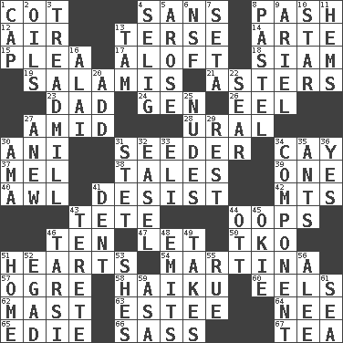 ACROSS 1. Small bed 4. Without 8. Romantic infatuation 12. Atmosphere 13. Laconic 14. Johnson of "Laugh-In" 15. Entreaty 17. At or to great height 18. Thailand, formerly 19. Deli grouping 21. Michaelmas daisies 23. June honoree 24. Commissioned military rank (abbr.) 26. Snakelike fish 27. Among 28. Mountain range 30. Cuckoo 31. Sowing specialist 34. Island 37. Cartoonist voice _ Blanc 38. Stories 39. Single 40. Leather borer 41. Cease 42. Mountains (abbr.) 43. Wig 44. I made a mistake 46. "___ Little Indians" 47. Allow 50. Ring climax 51. Centers of feelings and intuitions 54. Chrissie's court nemesis 57. Legendary monster 58. Japanese verse 60. Snakelike fish 62. Vertical spar for supporting sails 63. First name in cosmetics 64. Born 65. Singer Brickell 66. Backtalk 67. Afternoon social gathering DOWN 1. Head covering 2. Lubricates 3. Excercise machine 4. Former Milwaukee Brewers owner Bud 5. Came up 6. Overdraft (abbr.) 7. Bristle 8. Soft color 9. Satellite of Uranus 10. Play the lead 11. Folds over and sews together 13. Scottish cap 16. Jai ____ 20. Increase 22. Singe 25. Unadorned figures 27. Afresh 29. Repose 30. Nanny (var.) 31. Proofreading order 32. Artist's stand 33. Biblical high priest 34. Piece 35. Pismires 36. Affirmative reply 41. Undesirable depression on a surface 43. Cylindrical with tapered ends 44. Baseball player Mel 45. Migrant worker of the '30s 46. Tarsus (plural) 48. Sends forth 49. Receives possession of 51. Dwelling 52. Mild oath 53. "______ My Girl" (Turtles hit) 55. Sorrow 56. Toward shelter 59. White ___ sheet 61. Ocean