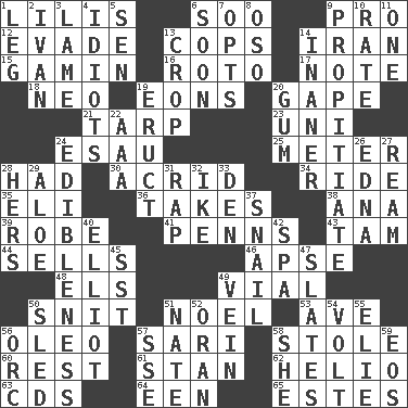 ACROSS 1. Ms. Damita and namesakes 6. "Barney Miller" actor Jack 9. Adept person 12. Elude 13. 911 reaches them 14. SW Asia republic 15. Homeless child 16. Printing process, for short 17. Observe 18. Modern: prefix 19. Immeasurably long periods of time 20. Stare wonderingly 21. Canvas cover 23. University (slang) 24. Son of Isaac 25. Distance measurement 28. Possessed 30. Bitter 34. Travel on or in a vehicle 35. Connecticut Ivy Leaguer 36. Receives possession of 38. Santa ___, CA 39. Loose flowing garment 41. Actor Sean's family 43. Scottish cap 44. Makes a sale 46. Domed church section 48. Raised railways 49. Small bottle 50. In a ____ (agitated or irritated) 51. Christmas carol 53. "___ Maria" 56. Margarine 57. Indian skirt 58. Fur scarf 60. Take ten 61. Comedian Laurel of Laurel & Hardy 62. Sun: prefix 63. Music discs 64. Car or cant ending 65. _____ Park, CO DOWN 1. Part of a journey 2. _ the terrible 3. Unable to walk 4. Foolish or stupid persons 5. Elected rep. 6. Within a short period 7. Chooses 8. Bear (Spanish) 9. Appease 10. Assign a rank or rating to 11. Single 13. Riding implement 14. Sillier 19. Spew [out] 20. Chewing product 22. Auto club (abbr.) 24. The property of being fit to eat 26. Pulitzer Prize-winning author Ferber 27. 480, 500 or 516 sheets of paper 28. Possessive pronoun 29. Medicinal plant 31. Strike 32. Mamie's mate 33. Lair 37. Slow-paced one 40. American author Paul (1891-1958) 42. Health resort 45. Fast jet (abbr.) 47. Chalkboards 49. Distinctive style or manner 50. Downhill vehicle 51. Nathan's nickname 52. NW Algerian seaport 54. Electrical Unit 55. Writer Wiesel 56. The grampus (Milton) 57. Compass dir. 58. A female animal or person 59. Greek goddess of the dawn